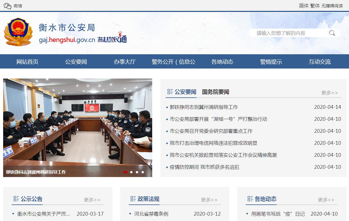 衡水市公安局主要职责:(一)按照市委、市政府和上级公安机关的指示,研究部署、组织实施全市公安工作,并督促检查执行情况。(二)研究社会主义市场经济体制下出现的新情况、新问题,制定新措施,推进全市公安工作的改革和发展。(三)搜集、掌握影响稳定、危害国家安全和社会治安的有关情况,分析形势,制定对策,适时组织实施。(四)指导对危害国家安全案件、刑事案件、经济犯罪案件的侦察工作,直接经办重特大案件。(五)指导全市公安机关依法查处治安案件,组织、协调、参与处置重大社会性案件和治安事故;承担特种行业管理工作;管理集会、游行和示威活动。 (六)指导、监督全市公安机关对国家机关、社会团体、企事业单位、重点建设工程的治安保卫工作和群众性治安保卫组织的治安防范工作。(七)组织实施消防工作,依法进行消防监督。(八)组织指导出境、入境和外国人在市内居留、旅行的有关管理工作。(九)组织指导全市公安机关的警卫工作。(十)负责全市收押场所及监视设备的建设和管理;指导对在押人员的监管、教育工作。(十一)指导、监督全市公安机关的执法活动。(十二)指导、监督全市公安机关维护道路交通安全、交通秩序以及对机动车辆、驾驶员的管理工作。(十三)规划和组织实施公安信息技术、刑事技术和行动技术建设。(十四)监督管理全市公共信息网络的安全监察工作。(十五)规划、组织、指导全市公安队伍正规化建设以及公安宣传、民警教育训练等思想政治工作;.负责全市警衔的授予和变动;按照规定管理协管干部。(十六)组织、指导全市公安机关的警务督察工作;查处和督办公安民警重大违法违纪案件。(十七)制定全市公安机关装备、被装配备规划,并负责管理工作;指导做好财务及经费等保障工作;搞好局机关的后勤保障和日常行政管理工作。(十八)承办市委、市政府和上级公安机关交办的其他任务。