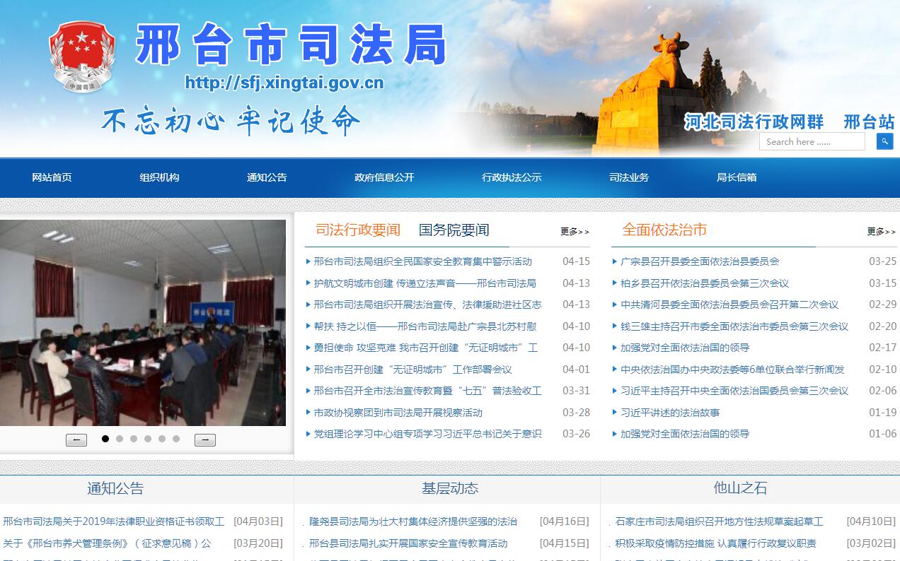 邢台市司法局是政府的司法行政部门。受市党委和政府领导,主管全市司法工作,是市政府宣传管理法律的专业职能部门。其主要职能是:一、贯彻执行国家、省司法行政工作的方针政策、法律法规及规章,拟订全市相关政策、措施和办法,经市政府批准组织实施。制定全市司法行政工作中长期规划并组织实施。二、负责全市违法行为教育矫治工作;负责指导、监督全市司法行政系统戒毒所的管理;负责社区矫正工作。三、拟订全市普及法律常识规划并组织实施;指导全市各地、各行业法制宣传、依法治理工作。四、指导、监督全市律师工作、公证工作并承担相应责任;指导邢台市律师协会、邢台市公证员协会。五、负责实施和监督管理全市法律援助工作。六、负责组织实施并指导、监督基层司法所建设和人民调解、基层法律服务和帮教安置工作;指导人民调解员协会工作。七、负责组织实施全市司法考试、考务等工作,指导法学教育协会工作。八、主管全市司法鉴定人和司法鉴定机构的登记管理工作。九、负责仲裁登记初审工作。十、负责全市司法行政系统警务装备管理工作;指导、监督全市司法行政系统计划财务工作;负责直属单位经济财务等活动的内部审计监督。十一、指导、监督全市司法行政系统班子建设和队伍建设;负责全市司法行政系统警务督察工作;协助县(市、区)管理司法局领导干部。十二、承办市政府交办的其他事项。