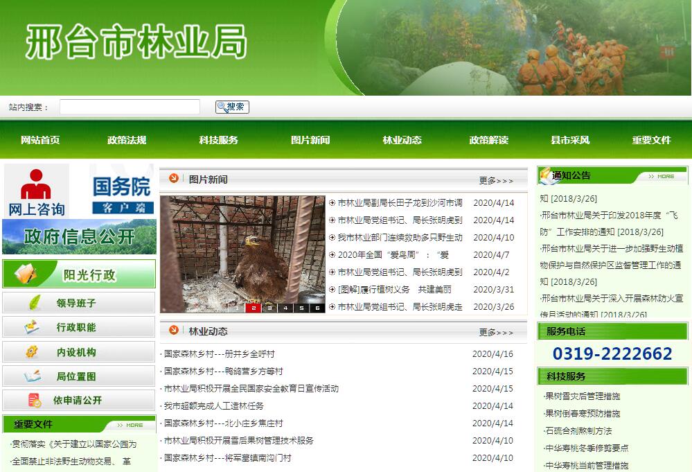 邢台市林业局(简称市林业局)为市政府工作部门,其主要职责是:(一)负责全市林业和草原及其生态保护修复的监督管理。拟订全市林业和草原及其生态保护修复的政策、规划、地方标准并组织实施,起草相关政府规章草案。组织开展全市森林、草原、湿地、荒漠和陆生野生动植物资源动态监测与评价。(二)组织全市林业和草原生态保护修复和造林绿化工作。组织实施林业和草原重点生态保护修复工程,指导公益林和商品林的培育,指导、监督全民义务植树、城乡绿化工作。指导林业和草原有害生物防治、检疫工作。承担林业和草原应对气候变化的相关工作。(三)负责全市森林、草原、湿地资源的监督管理。组织编制并监督执行全市森林采伐限额。负责林地管理,拟订全市林地保护利用规划并组织实施,指导全市公益林划定和管理工作。管理市属国有林场的森林资源。负责全市草原禁牧、草畜平衡和草原生态修复治理工作,监督管理草原的开发利用。负责全市湿地生态保护修复工作,拟订全市湿地保护规划和相关地方标准并组织实施,监督管理湿地的开发利用。(四)负责监督管理全市荒漠化防治工作。组织开展荒漠调查,组织拟订全市防沙治沙及沙化土地封禁保护区建设规划,拟订相关地方标准和规定并监督实施,监督管理沙化土地的开发利用,组织沙尘暴灾害预测预报和应急处置。(五)负责全市陆生野生动植物资源监督管理。组织开展陆生野生动植物资源调查,研究提出国家和省重点保护的陆生野生动物、植物名录的调整建议,指导全市陆生野生动植物的救护繁育、栖息地恢复发展、疫源疫病监测,监督管理全市陆生野生动植物猎捕或采集、驯养繁殖或培植、经营利用,按分工监督管理野生动植物进出口。(六)负责监督管理全市各类自然保护地。拟订全市各类自然保护地规划和相关地方标准。承办国家公园规划、管理和监督,提出新建、调整各类市级以上自然保护地的审核建议并按程序报批,组织审核世界自然遗产的申报,会同有关部门审核世界自然与文化双重遗产的申报。负责全市生物多样性保护相关工作。(七)负责推进全市林业和草原改革相关工作。拟订集体林权制度、国有林场、草原等重大改革意见并监督实施。拟订农村林业发展、维护林业经营者合法权益的政策措施,指导监督农村林地承包经营工作。开展退耕(牧)还林还草,负责天然林保护工作。(八)拟订全市林业和草原资源优化配置及木材利用政策,拟订相关林业产业地方标准并监督实施,组织、指导林产品质量监督,指导生态扶贫相关工作。(九)指导全市国有林场基本建设和发展,组织开展林木种子、草种种质资源普查,组织建立种质资源库,负责良种选育推广,管理林木种苗、草种生产经营行为,监管林木种苗、草种质量。监督管理林业和草原生物种质资源、转基因生物安全、植物新品种保护。(十)指导全市森林公安工作,监督管理森林公安队伍,指导全市林业重大违法案件的查处,负责相关行政执法监管工作,指导林区社会治安治理工作。(十一)负责落实全市综合防灾减灾规划相关要求,组织编制全市森林和草原火灾防治规划和防护标准并监督实施,指导开展防火巡护、火源管理、防火设施建设等工作。组织指导全市森林和草原防火宣传教育、监测预警、督促检查等防火工作。必要时,可以提请市应急管理局,以市应急指挥机构名义,部署相关防治工作。(十二)监督管理林业和草原中央、省级和市级资金及国有资产,提出全市林业和草原预算内投资、中央、省级和市级财政性资金安排建议,按权限审核规划内和年度计划内投资项目。参与拟订林业和草原经济调节政策,组织实施林业和草原生态补偿工作。(十三)负责全市林业和草原科技、教育和外事工作,指导全市林业和草原人才队伍建设,组织实施林业和草原国际交流与合作事务,承担湿地、防治荒漠化、濒危野生动植物等国际公约履约工作。(十四)完成市委、市政府交办的其他任务。