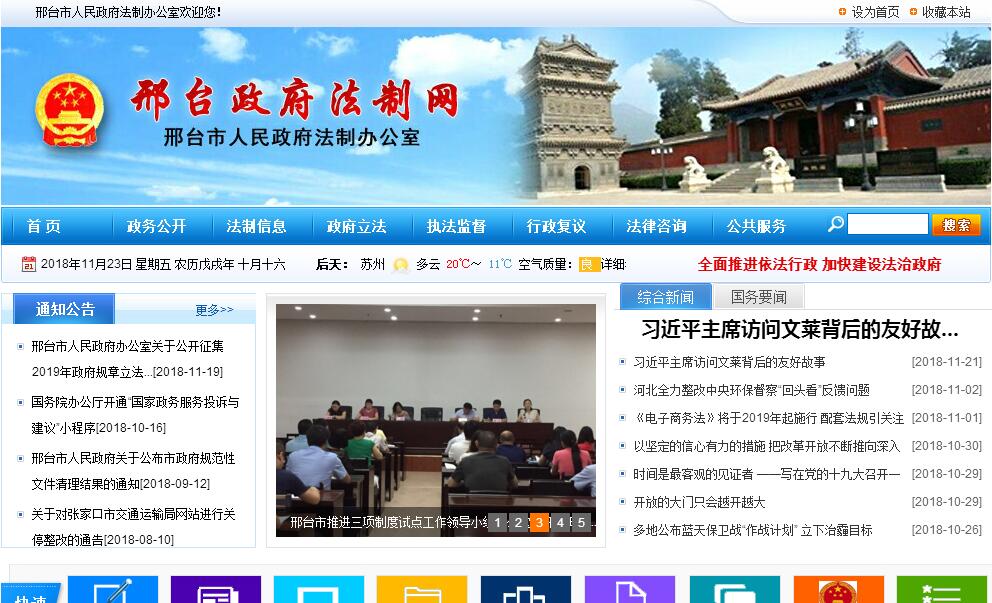 根据《邢台市人民政府关于市政府机构设置的通知》(邢政〔2009〕19号),邢台市人民政府法制办公室设在市政府办公室,对外挂牌,为市政府工作部门。其主要职能:(一)调查研究依法行政和政府法制建设中出现的新情况、新问题,提出推进依法行政的具体措施和工作建议,在市政府全面推进依法行政中,发挥统筹规划、综合协调、督促指导、政策研究和情况交流作用。协助市长办理法制工作事项。(二)负责审核以市政府名义签署的各类协议、合作类会议(会谈)纪要(备忘录)、责任书(状)等其他涉法具体行政行为。(三)承担统筹规划拟定市政府年度规范性文件制定工作计划,并组织实施和督促指导。(四)负责起草或者组织起草重要规范性文件草案;审查修改各部门报送市政府的规范性文件草案,提交市政府审议。承办市政府规范性文件的解释工作。(五)负责从法律角度对市政府政策措施审核,负责市政府部门规范性文件的前置审查,负责对各县(市、区)规范性文件的备案审查,根据不同情况提出处理意见。(六)研究行政诉讼、行政复议、行政赔偿、行政处罚、行政许可、行政收费等法律、法规、规章实施中带有普遍性的问题,向市政府提出完善制度和解决问题的意见,拟订有关配套文件和答复意见。(七)负责行政执法部门的资格认定和职权界定工作,负责行政执法证件、行政执法监督检查证件的审核发放、年检以及行政执法人员的资格审查和培训考试工作;负责行政执法监督检查工作;负责行政罚没许可证的审核、发放、年检和备案工作。(八)负责市政府做出的行政处罚、行政赔偿和补偿的审核工作。负责市政府做出的重大行政处罚的听证工作。(九)组织实施依法行政考核制度,负责行政执法年度评议考核工作;负责依法行政示范县、示范单位的创建管理工作。(十)依法承办行政复议案件;受市长委托,代理行政诉讼案件的应诉;指导、监督全市的行政复议工作。(十一)负责及时清理、编辑市政府规范文件汇编正式版本。指导各县(市、区)规范性文件清理工作。负责政府规范性文件外文翻译审定工作。(十二)协助落实市政府领导干部学法制度,受市政府的委托,承担领导干部任职前法律知识考查和测试工作。(十三)开展政府法制理论、政府法制工作研究和宣传。开展对外法制业务交流。负责编发政府法制信息,负责政府法制网站的建设与维护工作。(十四)承办省政府、省政府法制办公室及市人大常委会交办的法规、规章草案征求意见工作。承办市政府规范性文件上报省政府和市人大常委会备案工作。(十五)承办市政府交办的其他事项。