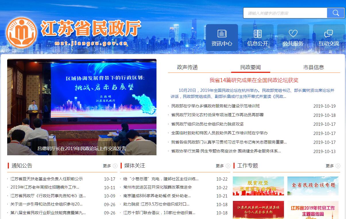 江苏省民政厅负责贯彻落实中央关于民政工作的方针政策和省委的决策部署,在履行职责过程中坚持和加强党对民政工作的集中统一领导。其主要职责是:(一)拟订全省民政事业发展政策和规划,起草有关地方性法规、规章草案和标准,并组织实施和监督检查。(二)拟订全省社会团体、基金会、社会服务机构等社会组织登记和监督管理办法并组织实施。依法对社会组织进行登记管理和监督检查。承担社会组织党建工作。(三)拟订全省相关社会救助政策、标准,统筹社会救助体系建设,负责城乡居民最低生活保障、特困人员救助供养、临时救助、生活无着流浪乞讨人员救助工作。(四)拟订全省城乡基层群众自治和社区治理办法,指导城乡社区治理体系和治理能力建设,提出加强和改进城乡基层政权建设的建议,推动基层民主政治建设。(五)拟订全省行政区划、行政区域界线管理和地名管理政策、标准,承担报省政府审批的行政区划设立、命名、变更和政府驻地迁移审核工作,组织指导乡镇级行政区域界线的勘定和管理工作,负责地名管理工作,负责跨市界自然地理实体命名、更名的审核工作,组织开展地名公共服务。(六)拟订全省婚姻管理政策并组织实施,推进婚俗改革。(七)拟订全省殡葬管理政策、服务规范并组织实施,推进殡葬改革。(八)拟订全省残疾人权益保护政策,统筹推进残疾人福利制度建设和康复辅具器具产业发展。(九)统筹推进、督促指导、监督管理全省养老服务工作,拟订养老服务体系建设规划、法规、政策、标准并组织实施,承担老年人福利和特殊困难老年人救助工作,推动居家养老和社区养老服务发展。(十)拟订全省儿童福利、孤弃儿童保障、儿童收养、儿童救助保护政策、标准,健全农村留守儿童关爱服务体系和困境儿童保障制度。指导全省儿童福利机构建设和管理。(十一)拟订全省促进慈善事业发展政策,负责慈善信托的备案、管理,组织指导社会捐助工作。(十二)拟订全省社会工作、志愿服务发展政策、标准和职业规范,会同有关部门推进社会工作专业人才队伍建设和志愿者队伍建设,承担志愿服务行政管理工作。(十三)拟订全省福利发行工作规定和实施办法,负责全省福利管理工作。(十四)完成省委、省政府交办的其他任务。