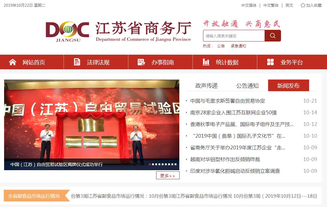 江苏省商务厅主要职责:(一)贯彻执行国家内外贸易、国际经济合作和有关口岸工作的法律法规及方政策,起草相关地方性法规、规章草案,拟订全省商务发展和实施规划。监测分析商务运行状况,研究经济全球化、区域经济合作、现代流通方式、开放型经济新体制和流通体制改革并提出建议。(二)拟订全省内贸发展规划,促进城乡商品市场发展,研究提出引导国内外资金投向商品市场体系建设的政策。指导城乡商业网点、商品交易市场(现货交易类)规划,推进城乡商业体系建设,组织实施农村现代流通网络工程。(三)负责推进流通产业结构调整,指导流通企业改革、商贸服务业发展,提出促进商贸中小企业发展的政策建议,推动流通标准化和连锁经营、商业特许经营、物流配送等现代流通方式的发展。拟订规范市场运行、流通秩序的政策,负责商务行政执法的业务指导。推动商务领域信用建设,指导商业信用销售,建立市场诚信公共服务平台。按有关规定对药品流通等特殊流通行业进行监督管理。(四)承担组织实施重要消费品市场调控和重要生产资料流通管理的责任,负责建立健全生活必需品市场供应应急管理机制。统计监测分析市场运行和商品供求情况,进行预测预警和信息引导。按分工负责重要消费品储备管理和市场调控工作。按有关规定对成品油流通进行监督管理。统筹商务领域消费促进工作。(五)研究拟订全省口岸工作政策和开放规划。按规定负责口岸开放或关闭的审查报批工作。负责协调推进全省电子口岸等口岸信息化建设与管理工作。负责“大通关”协调服务工作。(六)按规定负责全省国家级、省级开发区的指导、服务、协调和管理工作。拟订并组织实施促进开发区建设发展的政策措施,编制全省开发区发展规划草案,指导开发区编制建设规划。研究分析开发区建设中的重大问题并提出处理意见。(七)负责全省货物进出口管理工作。拟订发展规划和政策措施,指导外贸促进工作和外贸促进体系建设。指导、推进跨境电子商务等外贸新业态新模式发展,推进出口品牌和出口基地建设。负责重要工业品、原材料和农产品进出口计划、配额等管理工作,负责对外贸易经营者备案登记管理工作,负责机电产品进出口、机电产品国际招标管理工作,执行国家成套设备进出口政策。规范对外贸易经营秩序,推进进出口贸易标准化与便利化。(八)牵头拟订全省服务贸易发展规划,指导服务贸易领域的对外开放。会同有关部门拟订促进服务出口和服务外包发展的政策措施并组织实施,推动服务外包平台建设。执行国家对外技术贸易、鼓励技术政策,依法监督全省技术引进、国家限制出口技术的工作。(九)贯彻执行国家多双边(含区域、自由贸易试验区)经贸合作战略和政策,参与处理国别(地区)经贸关系中的有关事务,建立和发展与国(境)外政府经济部门的经济合作。(十)指导协调和管理全省外商投资工作,拟订外商投资政策和改革方案并组织实施,管理和指导全省外商投资审批、备案工作。会同有关部门拟订实施跨国公司地区总部和功能性机构鼓励政策,指导规范利用外资投资促进工作。(十一)负责全省对外投资和经济合作工作,拟订和执行促进对外投资合作的政策措施,管理和监督对外投资、对外承包工程、对外劳务合作等。依法核准、报批省内企业在境外投资开办企业和机构(金融企业除外)并实施监督与管理。负责全省对外援助项目和接受多(双)边对我省的无偿援助及赠款,推动构建对外投资合作促进和服务保障体系。(十二)组织协调我省企业发起或应对反倾销、反补贴、保障措施调查及其他与进出口公平贸易相关工作。建立进出口公平贸易预警机制,指导协调产业安全应对工作。执行国家进出口管制政策,负责协调我国加入世界贸易组织后地方综合性应对工作,参与公平竞争审查工作。(十三)贯彻执行国家有关自由贸易试验区建设的方针、政策、法规和制度,负责推进我省自由贸易试验区建设相关工作。承担全省海关特殊监管区域需要协调解决的有关工作。(十四)研究提出推进全省电子商务发展的政策意见,会同有关部门拟订全省电子商务发展规划。推进全省商务系统信息化建设,落实商贸服务领域电子商务发展工作。(十五)贯彻实施国家对香港、澳门特别行政区和台湾地区的经贸规划、政策,指导我省对香港、澳门特别行政区及台湾地区贸易工作,协调港、澳、台商投资管理工作,组织对香港、澳门特别行政区和台湾地区的经济交流与合作活动。(十六)负责我省海外经贸网络的建设与管理。(十七)协调海关、银行、外汇、出口信用保险等部门与商务工作有关的事项。受省政府委托,指导、管理省贸促会的工作。(十八)完成省委、省政府交办的其他任务。