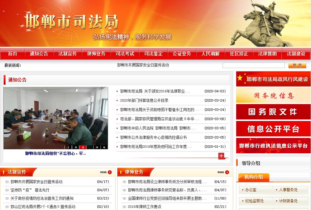 邯郸市司法局主要职责:1、贯彻执行党和国家及省司法行政工作的方针政策和法律法规,研究拟定全市司法行政工作的措施,编制司法行政工作中长期规划、年度计划并组织实施。2、制定全市法制宣传教育和普法依法治理工作规划并组织实施;制定全市法学成人教育规划、年度计划;指导全市对外法制宣传工作。3、管理和指导全市的律师、法律顾问、法律援助工作;组织制定全市律师工作发展规划以及律师管理的有关办法;管理全市社会法律咨询服务机构及在我市设立的外地律师机构。4、制定全市公证改革与发展的总体规划并组织实施;管理和指导公证机构,负责公证业务质量的监督检查,负责审查涉外、涉港澳台公证事务。5、制定全市人民调解工作总体规划并组织实施;指导各县(市、区)司法行政机关人民调解工作和基层法律服务工作,参与社会治安综合治理。6、指导对刑满释放人员和解除劳动教养人员的过渡性安置帮教工作;负责全市刑满释放人员和解除劳动教养人员安置帮教工作的统计、分析、上报。7、管理和指导面向社会服务的司法鉴定工作;按照有关规定,负责司法鉴定机构设立登记的初审和上报。8、负责仲裁机构的审核、申报工作。9、管理全市司法行政系统的协会和学会;管理和指导全市的法学理论研究;制定全市法学教育和司法行政干警培训规划及企业法律顾问培训规划。10、协调和指导全市“148”法律服务专线工作,受理群众寻求法律服务事宜;解答法律咨询,普及法律知识;掌握重大民间纠纷信息,提供决策依据和信息服务。