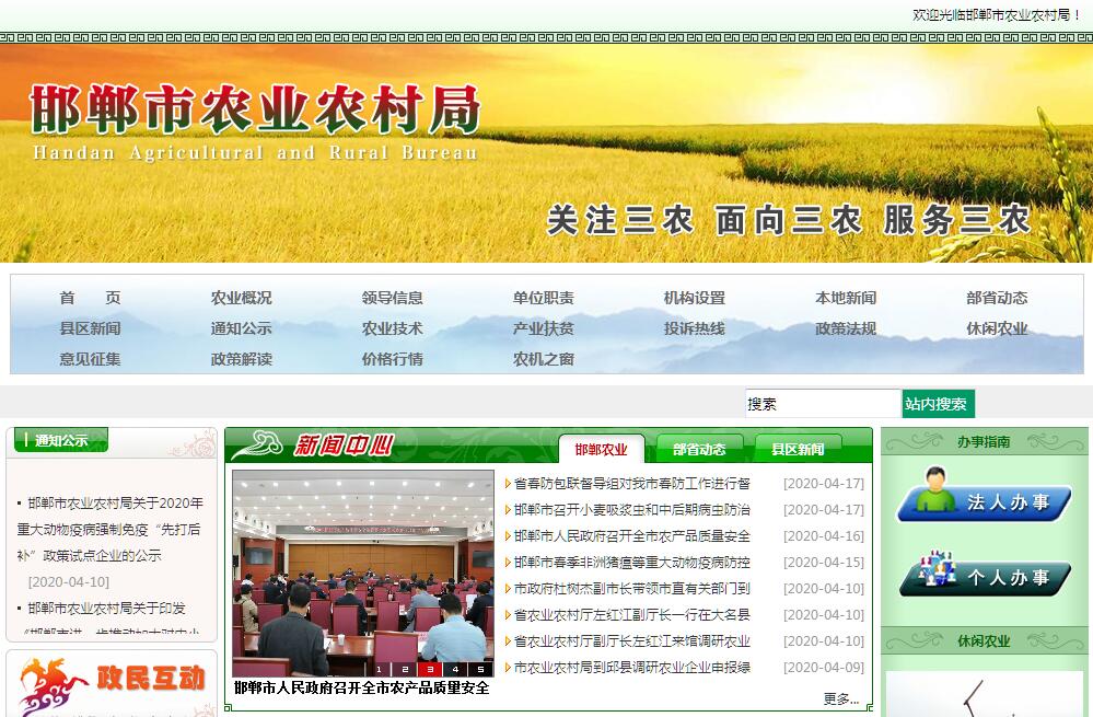 邯郸市农业农村局主要职责:一、拟订种植业、畜牧业、渔业、粮食、新能源、农业机械化等农业各产业(以下简称“农业”)和农村发展政策、发展战略、中长期发展规划并指导实施,参与涉农的财税、价格、金融保险、进出口等政策制订,组织起草农业和农村经济地方性法规、政府规章草案,推进农业依法行政;对贯彻落实行业有关法律法规、政策制度进行监督检查;受理行政复议,指导行业监督检查和行政执法工作。二、指导粮食等主要农产品生产,组织落实促进主要农产品生产发展的相关政策措施和有关粮食流通的法规、政策,引导农业产业结构调整、布局调整和产品品质改善;会同有关部门指导农业标准化、规模化生产;负责提出农业固定资产投资规模和方向、财政性资金安排的意见,按规定权限审批、核准市规划内和年度计划规模内固定资产投资项目;编报部门预算并组织执行;提出扶持农业农村发展的财政政策和项目建议,经批准后制订实施方案并指导实施;研究拟订全市粮食流通和市级储备粮管理的政策制度并组织实施;指导、深化粮食流通体制改革。三、促进农业产前、产中、产后一体化发展,组织拟订促进农产品加工业发展政策、规划并组织实施;提出农业产业保护政策建议;指导农产品加工业结构调整、技术创新和服务体系建设;提出促进大宗农产品(粮食)流通的政策建议和主要农产品的进出口建议;制订大宗农产品(粮食)市场体系建设与发展规划并组织实施;培育、保护和发展农产品品牌;编制粮食流通、仓储、加工设施建设规划,管理有关粮食流通设施投资项目;负责全市粮食流通设施建设规划布局。四、承担提升农产品质量安全水平的责任;负责食用农产品从种植养殖环节到进入批发、零售市场或生产加工企业前的质量安全监督管理;依法开展农产品质量安全风险评估,发布有关农产品质量安全状况信息,负责农产品质量安全监测;提出技术性贸易措施的建议;负责落实国家和省粮食质量标准、粮食检验政策、制度和办法;参与制订农产品质量安全市级标准并会同有关部门组织实施;负责绿色食品企业年检;指导农业检验检测体系建设;依法实施符合安全标准的农产品质量认证和监督管理;组织农产品相关环节的质量安全监督管理;负责畜禽屠宰环节、生鲜乳收购环节质量安全监督管理;负责全市粮食储存保管及安全生产工作,对粮食收购、储存环节的粮食质量安全和原粮卫生进行监督管理。五、组织、协调农业生产资料市场体系建设;依法开展农作物种子(种苗)、种畜禽的生产、经营许可及监督管理;依法负责草种、水产苗种、农药、兽药、饲料、饲料添加剂、渔船、渔机、网具、兽医医疗器械和有关肥料的监督管理;指导农业机械化发展和农机安全监理。六、负责农作物和畜牧水产重大病虫害防治;起草动植物防疫和检疫的地方性法规、政府规章草案;会同有关部门制订相关动植物防疫、检疫政策并指导实施,指导相关动植物防疫和检疫体系建设;组织、监督对市内相关动植物的防疫检疫工作,发现疫情并及时组织扑灭;负责省间调运植物和植物产品、产地植物检疫证书签发;组织农作物检疫性有害生物普查;组织兽医医政、兽药药政药检工作;负责执业兽医的管理。七、承担农业防灾减灾的责任;检测、发布农业灾情,组织种子、花肥等救灾物资储备和调拨,提出生产救灾资金安排建议,指导紧急救灾和灾后生产恢复。八、管理农业和农村经济信息,监测分析农业和农村经济运行,开展相关农业统计工作;发布农业和农村经济信息,负责农业信息体系建设,指导农业信息服务。九、制订全市相关农业科研、农技推广的规划、计划和有关政策,会同有关部门组织全市农业科技创新体系和农业产业技术体系建设,实施科教兴农战略,指导农业领域的高新技术和应用技术研究,组织实施相关农业科研专项、农业科技成果转化和技术推广工作;组织引进国内外农业先进技术,指导农技推广体系改革与建设;负责畜牧水产和农业植物新品种保护,负责农业转基因生物安全监督管理。十、会同有关部门拟订农业农村人才队伍建设规划并组织实施,指导农业教育和农业职业技能开发工作,参与实施农村实用人才培训工程;参与农村劳动力转移就业培训和新型职业农民培育培训工作,会同有关部门依法实施农业农村人才专业技术资格和从业资格管理。十一、参与农业资源区划工作,指导农用地、畜牧水产用地、渔业水域、宜农滩涂、宜农湿地及农业相关生物物种资源的保护和管理;负责水生野生动植物保护工作;拟订耕地及基本农田质量保护与改良政策并指导实施,依法管理耕地质量;运用工程设施、农艺、农机、生物等措施发展节水农业;会同有关部门处理重大渔事纠纷,维护管辖水域渔业权益;依法行使渔政、渔港和渔业船舶检验监督管理权。十二、制订并实施农业生态建设规划,指导农村可再生能源综合开发与利用,指导农业生物质产业发展和农业农村节能减排,承担指导农业面源污染治理有关工作;提出划定农产品禁止生产区域建议,指导生态农业、循环农业等发展;负责保护渔业水域生态环境;牵头管理外来物种。十三、负责行业对外交流与合作,承办农业涉外事务,组织开展农业贸易促进和有关国际经济、技术交流与合作;参与农业对外援助政策和规划制订