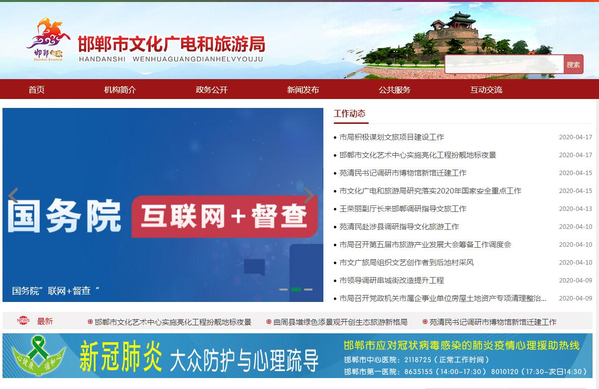 邯郸市文化广电和旅游局的主要职责是:(一)贯彻执行党和国家文化、广播电视、网络视听节目和旅游工作方针政策和法律法规。研究拟订全市文化、广播电视、网络视听节目和旅游政策措施,起草全市文化、广播电视、网络视听节目服务管理和旅游地方性法规、政府规章草案。(二)拟订全市文化事业、文化产业、广播电视领域和旅游业发展规划并组织实施,推进文化、广播电视和旅游融合发展,推进文化、广播电视和旅游体制机制改革。(三)管理和组织全市性重大文化、广播电视和旅游活动,组织实施全市公共服务重大工程。指导全市重点文化和旅游设施建设,组织邯郸文化和旅游整体形象推广,促进对外合作和国际市场推广;制定全市旅游市场开发营销战略并组织实施,指导、组织推进全域旅游。扶助老少边贫地区广播电视建设和发展。(四)负责全市文化、广播电视和旅游事业发展。推动全市文化、广播电视和旅游公共服务体系建设,深入实施文化惠民工程,统筹推进全市文化、广播电视和旅游服务标准化、均等化。负责全市文化、广播电视和旅游统计工作。(五)统筹规划全市文化产业、广播电视产业和旅游产业。组织实施文化和旅游资源普查、挖掘、保护和开发利用工作,促进文化产业、广播电视产业和旅游产业发展。(六)指导、推进全市文化、广播电视和旅游科技创新发展,推进文化、广播电视和旅游行业信息化、标准化建设。(七)指导、管理全市文艺事业。指导艺术创作生产,扶持体现社会主义核心价值观、具有导向性代表性示范性的文艺作品,推动全市各门类艺术、各艺术品种发展。指导全市电视剧行业发展和电视剧创作生产。(八)组织协调文化遗产的管理和保护,指导和管理文物、博物馆事业,组织指导文物的保护抢救、考古发掘和开发利用工作。(九)负责全市非物质文化遗产保护,推动非物质文化遗产的保护、传承、普及、弘扬和振兴。(十)指导全市文化、广播电视和旅游市场发展。对文化、广播电视和旅游市场经营进行行业监管,推进全市文化、广播电视和旅游行业信用体系建设,依法规范文化、广播电视和旅游市场。(十一)负责对全市各类广播电视机构进行业务指导和监管,会同有关部门对全市网络视听节目服务机构进行管理,推进广播电视与新媒体新技术新业态融合发展,推进广电网与电信网、互联网三网融合;负责对广播电视节目传输覆盖、监听、监看、监测的监管,指导、监管全市广播电视广告播放;推进全市应急广播体系建设,监管协调调度全市广播电视安全播出。(十二)指导、监督全市文化、文物、出版、广播电视、电影、旅游等市场综合执法。督查督办全市性、跨区域性大案要案,维护市场秩序。(十三)承担全市文化、广播电视和旅游行业安全综合协调和监督管理工作,负责全市文化、广播电视和旅游行业突发应急事件的处理工作。(十四)指导、管理全市文化、广播电视和旅游对外及对港澳台交流、合作和宣传、推广工作。代表市政府签订对外文化、广播电视和旅游合作交流协定,组织大型文化、广播电视和旅游对外及对港澳台交流活动,推动中华文化和邯郸特色文化走出去。负责全市广播电视节目的进口、收录和管理。(十五)负责对全市各类广播电视结构进行业务指导和行业监管,会同有关部门对全市网络视听节目服务机构进行管理。指导、协调广播电视全市性重大宣传活动及广播电视创新创优工作。(十六)指导全市文化、广播电视、网络视听和旅游行业人才队伍的建设。(十七)管理市文化市场综合行政执法局。(十八)完成市委、市政府交办的其他任务。