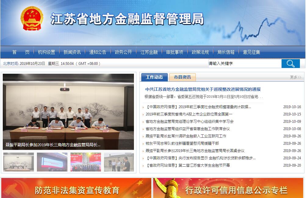 江苏省地方金融监督管理局(以下简称“省地方金融监管局”)成立于2018年10月,是省政府直属机构,为正厅级,加挂江苏省人民政府金融工作办公室牌子。根据《省委办公厅 省政府办公厅〈关于印发江苏省地方金融监督管理局职能配置、内设机构和人员编制规定〉的通知》(苏办﹝2019﹞18号),省地方金融监管局主要职责有:(一)在坚持金融管理主要是中央事权的前提下,按照中央统一规则,履行地方金融监督管理职责;在国务院金融稳定发展委员会指导下,推动地方金融改革发展;协同配合驻苏中央金融管理部门建立信息共享、风险处置、业务发展和消费者保护等协作机制;负责地方金融业综合统计相关工作。(二)贯彻执行金融法律法规和方针政策;研究拟订地方金融监督管理领域的地方性法规、规章草案;研究拟订地方金融监督管理职责范围内发展规划和政策;加强对地方金融监督管理领域运行情况的监测分析,配合驻苏中央金融管理部门研究分析全省金融运行形势,提出改善金融环境、加强金融服务、促进金融业发展的建议。(三)联系协调驻苏金融机构,配合驻苏中央金融管理部门规范发展全省上市公司;推进全省金融改革创新工作,配合驻苏中央金融管理部门引导银行业金融机构优化资源配置、推动多层次资本市场建设、加快现代保险服务业发展。(四)负责全省小额贷款公司、融资担保公司(含融资再担保公司)、典当行、融资租赁公司、商业保理公司、区域性股权市场以及从事经中央金融管理部门批准可开展金融企业不良资产批量收购处置业务的地方资产管理公司的监督管理。(五)负责强化对全省开展信用互助的农民专业合作社(含农民资金互助合作社)和具有金融属性但不属于中央金融管理部门监管的投资公司、社会众筹机构、地方各类交易场所的监督管理。(六)推动落实金融风险防范处置属地责任,组织协调有关部门防范化解地方金融风险、处置地方金融突发事件和重大事件,协同配合驻苏中央金融管理部门健全全省金融风险监测预警体系和早期干预机制。(七)会同有关部门依法防范查处非法金融机构及非法金融业务;组织协调有关部门依法做好防范和处置非法集资工作,承担省打击和处置非法集资工作领导小组办公室的日常工作。(八)完成省委、省政府交办的其他事项。