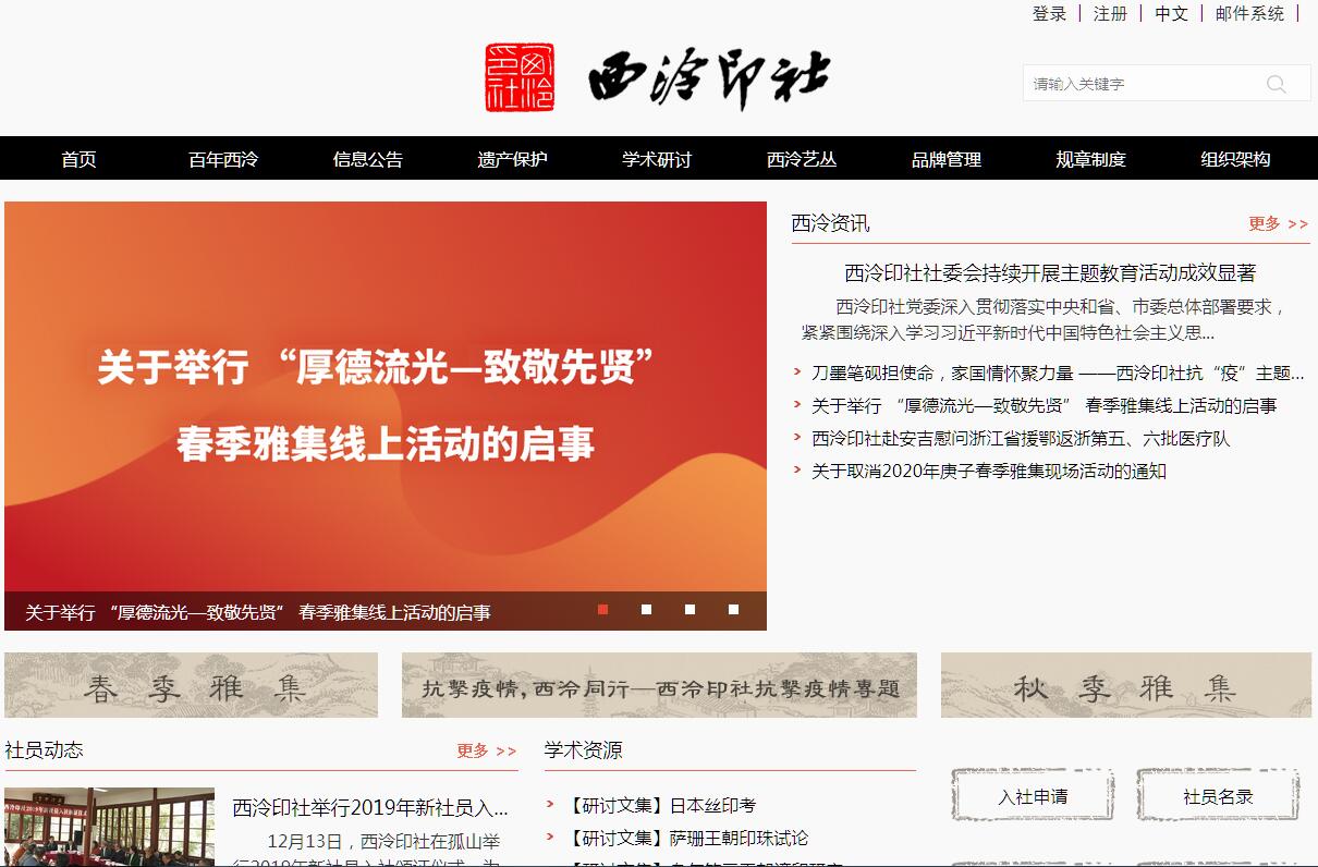 西泠印社创立于清光绪三十年(1904年),是我国现存历史最悠久的文人社团,也是海内外成立最早的金石篆刻专业学术团体。西泠印社社址坐落于浙江省杭州市西湖景区孤山西麓,南至白堤,西近西泠桥,北邻里西湖,占地面积7088.86平方米,建筑总面积1749.77平方米,为国家重点文物保护单位。社址内包括多处明清古建筑遗址,园林精雅,景致幽绝,人文景观荟萃,摩崖题刻随处可见,有“湖山最胜”之誉。西泠印社由浙派篆刻家丁仁、王禔、吴隐、叶铭等召集同人发起创建。1913年,近代艺坛巨擘吴昌硕出任首任社长,盛名之下,天下印人翕然向风,东瀛名家河井荃庐、长尾雨山渡海来归,一时精英云集,入社者均为精擅篆刻、书画、鉴藏、考古、文史等之卓然大家。截止2018年5月,西泠印社现有社员约506人,分布于中国境内近30个省(市)自治区、香港、澳门特别行政区、台湾地区和日本、韩国、新加坡、马来西亚、法国、捷克、加拿大等国家。创立以来,西泠印社始终以一种现代意义的社团组织形式从事古典的艺术探索,以宽松的运作理念主张艺术的多元性,延续着创社以来每年春秋两季雅集、逢五、逢十周年庆典和社员不定期聚会的社团运行模式。每年以孤山社址为中心,公祭印学先贤、举办社员作品和藏品展览、开展学术研讨和交流等活动,诗词吟咏、笔墨酬唱、赏鉴珍藏、品茗清谈均无不可,在传统文化土壤日渐衰微的当代文化环境下,依然生动完好地保存着具有传统文人气质的文化形态。除金石篆刻与书画艺术的创作研习之外,西泠印社在文物收藏与研究、编辑出版、对外文化交流等领域均有重要建树,藉海内外社员与各界贤达之力,对各类文物遗存博采旁搜,藉资考古,位于孤山西泠桥畔的中国印学博物馆为我国惟一的印学专业博物馆,西泠印社印学图书馆则专收一切考论金石、古器、书画等之书籍,供同人鉴赏研究之用。西泠印社还搜辑、考订、出版了大量印谱、碑帖与印学研究著作,刊行海内外。西泠印社还着力于篆刻艺术的传承、普及与推扬,自上世纪80年代以来,连续举办篆刻作品评展、国际篆刻书法作品展等大型专业赛事,近年来还举办了西泠印社国际艺术节、“百年西泠·中国印”、“百年西泠·西湖风”、“百年西泠·金石缘”等大型国际性艺术选拔和创作、展览、研讨活动,在海内外印学界产生广泛影响。西泠印社于2004年经国家民政部批准注册登记。 2006年,“金石篆刻(西泠印社)”成为首批国家级非物质文化遗产代表作。2009年,由西泠印社领衔申报的“中国篆刻艺术”成功入选联合国教科文组织 “人类非物质文化遗产代表作”,进一步确立了西泠印社作为篆刻传承代表组织和国际印学中心的地位。时至今日,西泠印社秉承“保存金石、研究印学,兼及书画”之宗旨,融诗书画印于一体,已成为海内外研究金石篆刻历史最悠久、成就最高、影响最广的艺术团体,在国际印学界享有崇高地位,有“天下第一名社”之盛誉。西泠印社社务委员会成立于2003年1月,是中共杭州市委直属相当正局级的事业单位,归口中共杭州市委宣传部管理,为从事公益服务的事业单位。西泠印社社务委员会主要职责如下:1、承担西泠印社社团的日常事务,组织开展学术研究、学术交流、教育和宣传活动,支持和促进社团的艺术创作;2、负责国家重点文物保护单位孤山社址、“西泠印社”品牌和西泠印社文物藏品、艺术资料等的保护和管理;3、承担金石篆刻国家及世界非物质文化遗产保护和传承的相关工作;4、承担市委、市政府交办的其他工作西泠印社社务委员会设6个内设机构(相当正处级),分别为:党委办公室(社委会办公室)、监察室、社团事务处、艺术创研处、文物管理处、信息处。