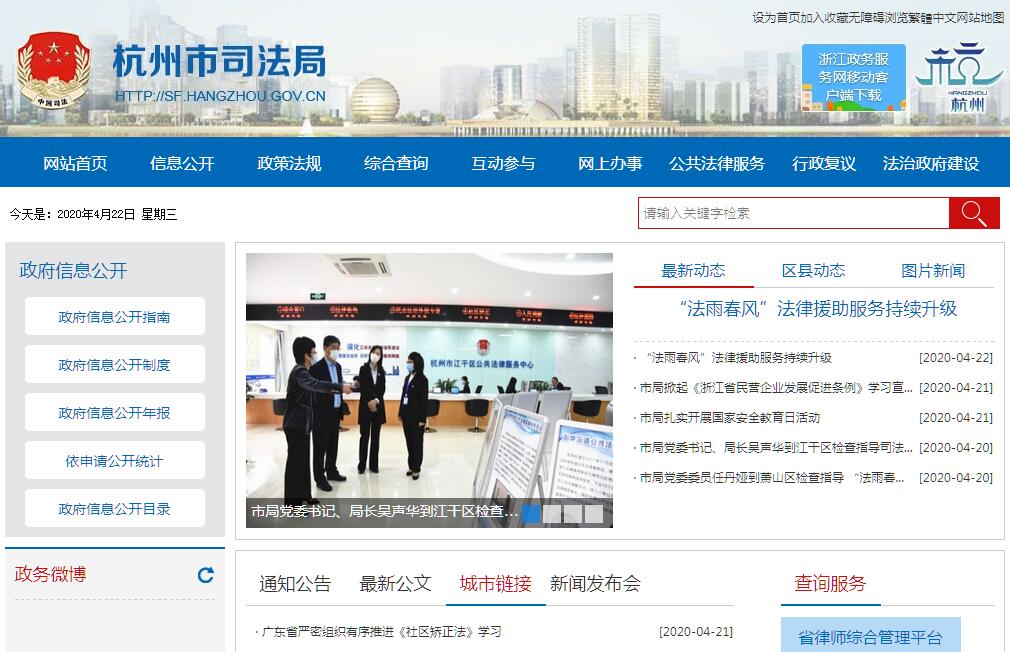 杭州市司法局主要职责:(一)贯彻执行中央、省有关司法行政的方针、政策、法律、法规和规章,受委托起草司法行政地方性法规、规章草案,经审议通过后组织实施;制定司法行政中长期规划并监督实施。(二)负责全市监狱管理工作,监督管理全市监狱执行刑罚、改造罪犯的工作。(三)负责司法行政系统戒毒管理工作。(四)拟订全市法制宣传与普法教育的规划并组织实施;指导全市法制宣传、依法治理和对外法制宣传工作。(五)指导全市司法行政机关管理基层司法所和人民调解、帮教安置工作;参与社会治安综合治理工作。(六)指导、管理全市社区矫正工作。(七)指导、监督全市律师、基层法律服务、公证工作;综合管理社会法律服务机构;指导相关行业协会工作。(八)监督管理全市面向社会的司法鉴定工作。(九)监督管理全市法律援助工作;指导、协调全市“12348”法律服务工作。(十)组织实施全市国家司法考试工作。(十一)指导、监督全市司法行政系统法制建设和依法行政工作;指导、协调全市司法行政系统的信息化建设。(十二)指导全市司法行政系统队伍建设、基层党建和思想政治工作;协助区、县(市)党委管理当地司法行政系统领导干部;负责全市司法行政系统的警务管理和警务督察工作。(十三)负责局直属单位的内部审计工作和直属单位领导干部的经济责任审计工作。(十四)负责全市司法行政系统警务装备的管理工作;指导、管理直属单位计划财务、安全生产、基本建设工作;领导和管理监狱劳教企业,负责局直属单位及监狱劳教企业国有资产的监督管理工作,保证国有资产保值增值。(十五)承办市政府交办的其他事项。