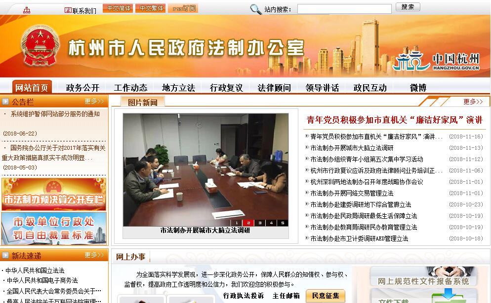 杭州市人民政府法制办公室是主管综合性法制工作事项的市政府直属机构。其主要职责:(一)调查研究依法行政和政府法制建设中出现的新情况、新问题,提出推进依法行政的具体措施和工作建议;协助市领导办理法制工作事项;负责市政府法律顾问工作。(二)承担统筹考虑、统一安排市政府立法工作的职责,研究拟订市政府立法工作年度计划,经批准后组织实施。(三)负责起草或组织起草重要的地方性法规、政府规章草案。负责对与群众利益密切相关的立法项目草案向社会公开征求意见。(四)负责审查起草市政府各部门报送市政府审议的地方性法规草案、政府规章草案,协调地方性法规草案、政府规章草案审查过程中的有关问题。(五)负责市政府规章的立法后评估工作;负责市政府规章的立法解释工作;办理市政府规章向国务院、省人大常委会、省政府和市人大常委会的备案工作。负责全国人大常委会、国务院、省人大常委会、省政府和市人大常委会的立法草案征求意见的办理工作。(六)办理市政府、市政府办公厅行政规范性文件的合法性审查工作;负责区、县(市)人民政府和市政府各部门的行政规范性文件及重大具体行政行为的备案审查工作。指导全市行政规范性文件清理工作。(七)受市政府委托,代理诉讼、仲裁、执行和其他非诉讼法律事务;为市政府的重大决策、行政行为、合同行为及其他法律事务提供法律意见。(八)承办市政府的行政复议案件和行政应诉案件;指导、监督区、县(市)人民政府和市政府各部门的行政复议、行政应诉工作;负责全市行政复议、行政应诉案件的统计工作。(九)牵头市政府各部门行政调解的组织协调工作;指导、监督全市行政调解工作。(十)负责行政执法主体资格的审查、认定工作;负责处理行政执法投诉;协调部门之间在行政执法中产生的矛盾和争议;负责市政府行政执法监督的具体工作。(十一)组织实施全市推进依法行政工作,协调依法行政工作中的有关问题;组织实施依法行政(行政执法责任制)工作评议考核;负责全市行政执法、行政复议、行政应诉和政府法制工作人员的培训和行政执法证件的发放管理工作。(十二)负责城市管理相对集中行政处罚权的有关业务指导和协调工作;参与研究推进行政执法体制改革工作。(十三)研究行政立法、行政复议、行政诉讼、行政调解、行政赔偿、行政处罚、行政许可、行政收费、行政执行等涉及政府行为共同规范的法律、法规、规章实施以及行政执法中带有普遍性的问题,向市政府提出完善制度和解决问题的意见,拟订有关配套制度和措施。(十四)组织清理市政府发布的规章及规范性文件;编辑出版本市地方性法规规章汇编;做好市政府规章和有关政策措施的组织翻译和上报工作;做好法律、法规、规章的宣传工作;组织开展政府法制理论研究和法制业务交流活动。(十五)负责市政府信息公开监督工作。(十六)受市政府委托,代管杭州仲裁委员会办公室。(十七)承办市政府交办的其他事项。