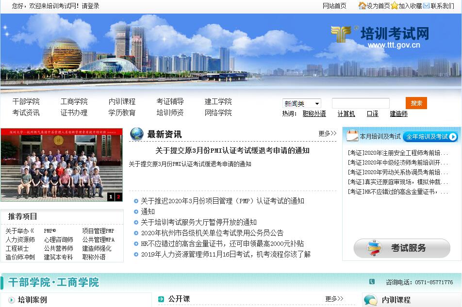 杭州培训考试网(www.ttt.gov.cn)创建于2002年,是一家立足杭州,服务全国的专业性门户网站,旨在为社会各类人员参加培训考试提供全面、及时、权威的供求信息的同时,为各考试培训机构建立一个快速准确的信息发布平台,为广大求知者提供一个方便快捷的学习途径。网站提供的主要内容:考试信息:提供各类公务员考试、职称考试、职业考试、执业考试等最新动态;培训信息:提供各类紧缺人才培训、高层次人才培训、企业内训、公务员培训、各类考试配套培训等最新动态;学历教育:提供各专业、多层次如:高升专、专升本、研究生等学历教育信息;网上报名:提供网上填报名表、网上打印报名表、网上打印准考证、网上查考分、网上购书、网上交费等全方位网上报名服务;考分查询:提供各类考试的成绩查询;考培论坛:提供一个考试培训需求者和考试培训提供者之间沟通、交流的平台;远程教育:提供丰富的远程教育资源,供学员在线学习。同时,杭州培训考试网也真诚期望与各机构倾力合作,共同制作、发布一些高品质、满足学员在线学习需求的远程课件 ;紧缺人才库:提供紧缺人才、高层次人才资源,是企业选聘人才的点将台;经过勤奋而精心地搜集、筛选和整理, 为您提供高效而有针对性的帮助和服务, 在您困难和疑惑的时候, 成为您的良师益友。 希望通过我们不懈努力, 也通过您的光顾和回馈, 汇聚起日益庞大的、目前和未来在中国考试培训行业最具发展潜力的稳定的顾客群体。竭诚欢迎广大考生和各界朋友成为我们网络考试培训事业的支持者、参与者、指导者。