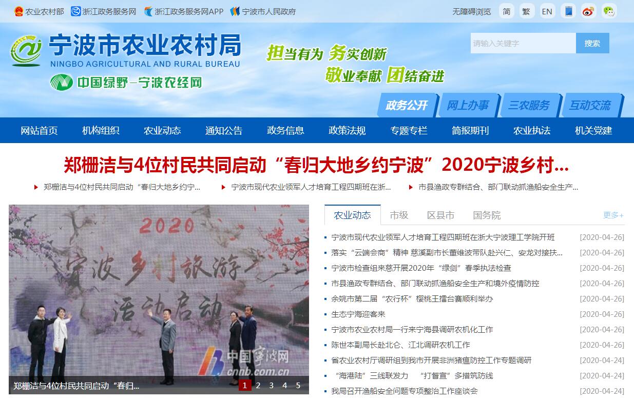 宁波市农业农村局主要职责:(一)统筹研究和组织全市实施“三农”工作的中长期规划、重大政策。在法定权限内组织起草农业农村地方性法规、规章草案和规范性文件。参与涉农的财税、价格、收储、金融保险等政策制定。(二)统筹推动发展全市农村社会事业、农村公共服务、农村文化、农村基础设施和乡村治理。组织实施“百村示范、千村整治”工程,牵头组织改善农村人居环境。指导农村精神文明和优秀农耕文化建设。(三)拟订深化农村经济体制改革和巩固完善农村基本经营制度的政策及配套措施。负责农民承包地、农村宅基地改革和管理有关工作。负责农村集体产权制度改革,指导农村集体经济组织发展和集体资产管理工作。指导农民合作经济组织、农业社会化服务体系、新型农业经营主体建设与发展。指导国有农场建设管理工作。(四)负责高效生态农业产业体系建设。指导乡村特色产业、农产品加工业、休闲农业和农家乐发展工作。提出促进大宗农产品流通的建议,培育、保护农业品牌,指导农产品营销管理工作和农业国际国内展示展销活动。发布农业农村经济信息,监测分析农业农村经济运行。承担农业统计和农业农村信息化有关工作。(五)负责种植业、畜牧业、渔业、林特产业、农业机械化等农业各产业的监督管理。指导粮食等农产品生产。组织构建现代农业产业体系、生产体系、经营体系,指导农业标准化生产。监督落实双多边渔业条约和协定。负责渔场修复振兴、远洋渔业管理和渔政渔港监督管理。负责农业机械、农药使用和渔业安全生产监督管理,负责农家乐安全管理工作,指导休闲观光农业安全管理工作,指导农业行业安全生产工作。落实农业农村领域生态环境保护要求,配合做好农业生态环境污染的调查处理工作。(六)负责农产品质量安全监督管理。负责组织开展农产品质量安全监测、追溯和风险评估。参与制定农产品质量安全地方标准并会同有关部门组织实施。指导农业检验检测体系建设。指导划定农产品禁止生产区域。(七)负责农业资源管理。指导农用地、渔业水域以及农业生物物种资源的保护与管理,负责水生野生动植物保护、耕地及永久基本农田质量保护工作。指导农产品产地环境管理和农业清洁生产。指导设施农业、生态循环农业、节水农业发展以及农村可再生能源综合开发利用、农业生物质产业发展。牵头管理外来物种。(八)负责有关农业生产资料和农业投入品的监督管理。拟订有关农业生产资料地方标准并监督实施。依法开展农业行政许可及其监督管理。组织兽医医政、兽药药政药检工作,负责执业兽医和畜禽屠宰行业管理。开展兽医器械和有关肥料的监督管理。(九)负责农业防灾减灾、农作物重大病虫害监测防治工作。指导动植物防疫检疫体系建设,组织、监督市内动植物防疫检疫工作,监测动植物疫情疫病,依法发布疫情并组织扑灭。组织主要农作物种子等农业救灾物资的储备和调拨。(十)负责农业投资管理。提出农业投融资体制机制改革、市投资安排的农业投资项目建设规划、农业投资规模和方向、扶持农业农村发展财政项目的建议。按权限审批农业投资项目、负责农业投资项目资金安排和监督管理。负责政策性农业保险工作。(十一)推动农业科技体制改革和农业技术推广队伍体系建设。指导农业产业技术体系和农技推广体系建设,组织开展农业领域应用技术研究、科技成果转化和技术、品种推广。负责农业转基因生物安全监督管理和农业植物新品种保护,按分工负责农业野生植物保护工作。(十二)指导监督并组织实施农业综合行政执法、农业法治监督和农业法规宣传。指导农业综合执法体系和农资信用体系建设,依法查处农业违法行为,指导、协调农业生产事故(纠纷)处理工作。(十三)指导农业农村人才工作。拟订农业农村人才队伍建设规划并组织实施,指导农业教育和农业职业技能开发。负责全市农村实用人才队伍的综合管理,牵头制定和实施乡村人才振兴计划,建设农村实用人才数据库。负责农村指导员工作,参与农村基层干部的教育培训工作。(十四)组织开展农业对外合作工作。承办有关农业涉外事务,组织开展农业贸易促进和有关国际交流合作,参与有关农业对外援助项目。(十五)拟订市内帮扶促进工作规划和政策并组织实施,协调督促帮扶促进工作。完成上级扶贫机构交办的有关工作。(十六)完成市委、市政府交办的其他任务。
