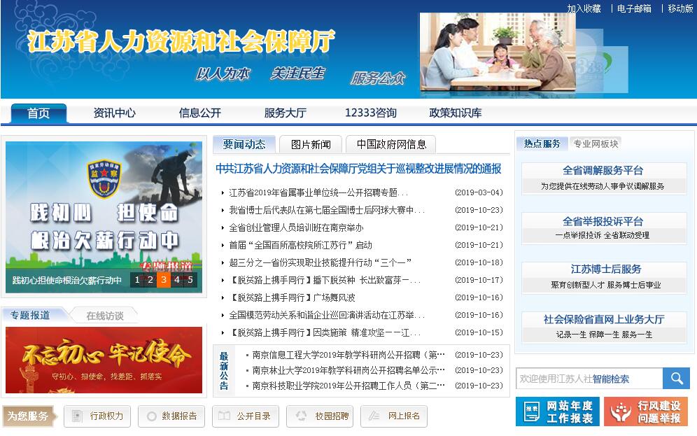 江苏省人力资源和社会保障厅负责贯彻落实中央关于人力资源和社会保障工作的方针政策和省委的决策部署,在履行职责过程中坚持和加强党对人力资源和社会保障工作的集中统一领导。其主要职责是:(一)贯彻实施国家人力资源和社会保障事业发展政策法规和规划,拟订全省人力资源和社会保障事业发展政策、规划,起草相关地方性法规、规章草案并组织实施。(二)拟订并组织实施全省人力资源市场发展规划和人力资源服务业发展、人力资源流动政策,促进人力资源合理流动、有效配置。(三)负责促进就业工作,拟订统筹全省城乡的就业发展规划和政策,完善公共就业创业服务体系,统筹建立面向全省城乡劳动者的职业技能培训制度,拟订就业援助制度,牵头拟订全省高校毕业生就业政策,会同有关部门拟订外国人来华工作政策。(四)统筹推进覆盖全省城乡的多层次社会保障体系。拟订并组织实施全省养老、失业、工伤等社会保险及其补充保险政策和标准。贯彻实施养老保险全国统筹办法和全国统一的养老、失业、工伤保险关系转续办法,拟订养老保险省级统筹意见。组织拟订养老、失业、工伤等社会保险及其补充保险基金管理和监督办法,编制相关社会保险基金预决算草案。会同有关部门实施全民参保计划并建立全省统一的社会保险公共服务平台。(五)负责全省就业、失业和相关社会保险基金预测预警和信息引导,拟订应对预案,实施预防、调节和控制,保持就业形势稳定和相关社会保险基金总体收支平衡。(六)统筹拟订劳动人事争议调解仲裁办法和劳动关系政策,完善劳动关系协商协调机制,拟订职工工作时间、休息休假和假期制度,拟订消除非法使用童工政策和女工、未成年工特殊劳动保护政策。组织实施劳动保障监察,协调劳动者维权工作,依法查处重大案件。(七)负责政府人才综合管理工作,组织实施重点人才工程和项目计划,牵头推进深化职称制度改革,拟订专业技术人员管理、继续教育和博士后管理等政策,负责高层次专业技术人才选拔和培养工作,拟订吸引留学人员来本省工作或定居政策。组织拟订技能人才培养、评价、使用和激励制度。完善职业资格制度,健全职业技能多元化评价政策。(八)会同有关部门指导全省事业单位人事制度改革,按照管理权限负责规范事业单位岗位设置、公开招聘、聘用合同等人事综合管理工作,拟订事业单位人员和机关工勤人员管理政策。(九)组织实施国家表彰奖励制度,会同有关部门拟订全省表彰奖励制度,综合管理全省表彰奖励工作,承担全省评比达标表彰和省级以下表彰等工作,根据授权承办以省委、省政府名义开展的表彰奖励活动。(十)会同有关部门拟订事业单位人员工资收入分配政策,建立企事业单位人员工资决定、正常增长和支付保障机制。拟订企事业单位人员福利和离退休政策。(十一)会同有关部门拟订全省农民工工作的综合性政策和规划,推动相关政策落实,协调解决重点难点问题,维护农民工合法权益。(十二)负责人力资源和社会保障领域对外交流与合作工作。(十三)完成省委、省政府交办的其他任务。