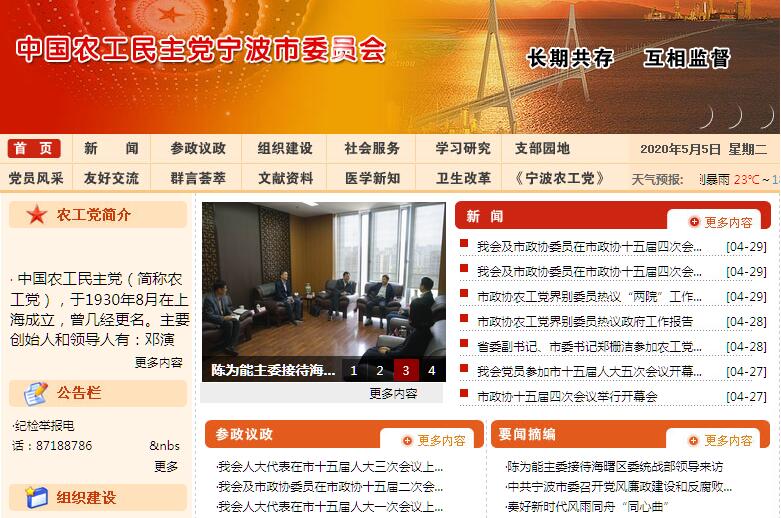 中国农工民主党(简称农工党),于1930年8月在上海成立,曾几经更名。主要创始人和领导人有:邓演达、黄琪翔、章伯钧、彭泽民、季方、周谷城、卢嘉锡、蒋正华、桑国卫、陈竺等。现任主席为陈竺。1927年5月,著名国民党左派领导人邓演达鉴于当时的武汉国民党中央已决意背叛革命,为了贯彻孙中山先生的“联俄、联共、扶助农工”三大政策,酝酿组织新的政党。1930年8月9日,他在上海主持召开了第一次全国干部会议,正式成立中国国民党临时行动委员会。1931年11月邓演达被蒋介石杀害。1935年本党率先响应中国共产党“停止内战,一致抗日”的《八一宣言》,于同年11月l0日在九龙召开第二次全国干部会议,改党名为中华民族解放行动委员会,同中国共产党密切合作,为推动抗日而努力。1941年3月,参与发起组织中国民主政团同盟,其主要领导人担任民盟重要领导职务。1947年2月,在上海召开第四次全国干部会议,决定改党名为中国农工民主党。1948年5月响应中共关于召开新政协会议、成立民主联合政府的“五一”号召。翌年9月,农工党的代表出席了中国人民政治协商会议第一届全体会议,参与制定《共同纲领》,选举中央人民政府,主要领导人在政府中担任重要领导职务。新中国成立后,农工党先后以《共同纲领》、《政协章程总纲》为政治纲领,制定了接受共产党领导、为社会主义服务的政治路线。进入新时期以来,农工党把工作重点转移到为社会主义现代化建设服务上来,积极参政议政,实行民主监督,对国家的经济文化建设和医药卫生事业的改革和振兴提出意见和建议,协助中共和政府贯彻落实知识分子政策,深入贫困地区为当地的经济开发出谋献策,开展咨询服务,举办业余教育,组织智力支边等,为促进改革开放,巩固和发展爱国统一战线,维护安定团结的政治局面发挥了积极作用。农工党的发展范围以医药卫生、人口资源环境领域高中级知识分子为主,以大中城市和有一定代表性人士为主。农工党目前在除台湾、西藏外的全国三十个省、自治区、直辖市建立了地方组织。中央机关刊物是《前进论坛》。农工党宁波市委员会成立于1956年,历任主委:陈世炤、吴元章、蒋德胜、毛宾尧、吴训威、常敏毅,现任主委陈为能。