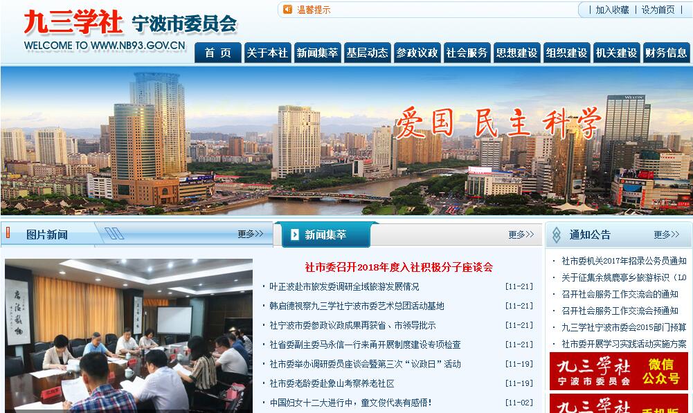 九三学社是以科学技术界高、中级知识分子为主的具有政治联盟特点的政党,是接受中国共产党领导、同中国共产党通力合作的亲密友党,是进步性与广泛性相统一、致力于中国特色社会主义事业的参政党。九三学社的前身为抗日战争后期一批进步学者发扬五四运动反帝反封建的爱国精神,以民主、科学为宗旨,在重庆组织的“民主科学座谈会”,后为纪念1945年9月3日抗日战争和世界反法西斯战争的伟大胜利,改建为“九三学社”。半个多世纪以来,九三学社秉承“爱国、民主、科学”的优良传统,同中国共产党在争取民族独立和人民解放的宏伟事业中风雨同舟,在社会主义革命和建设的历史进程中携手前进,在改革开放和社会主义现代化建设的伟大实践中团结奋斗,发展成为一支建设中国特色社会主义事业、维护国家安定团结的重要力量。1983年2月,九三学社浙江省工委秘书长章渭煊、委员宋镇圻等来甬发展社员并筹建组织。同年4月17日省工委宁波市省直属小组成立并选举顾明祥担任组长。1983年9月15日至16日,九三学社宁波市分社成立大会召开,选举产生了由杨国栋、顾明祥等7人组成的九三学社宁波市第一届分社委员会。1984年8月,九三学社宁波市分社委员会正式改称九三学社宁波市委员会。1988年7月,九三学社宁波市第二届委员会成立,杨国栋担任主委。第二届市委会期间,国际国内形势发生了很大变化。面对风云变幻的外部环境,社市委坚持中国共产党领导的多党合作和政治协商制度,与中国共产党风雨同舟、患难与共,保持了正确的政治方向,经受了政治风波考验,为推进两个文明建设和维护安定团结局面发挥了积极作用。1992年1月,九三学社宁波市第三届委员会成立,杨国栋担任主委。第三届市委会深入学习党的十四大重要精神,以建设有中国特色社会主义理论为指导,坚持党的基本路线,在参政议政、自身建设、社会服务等方面开展了大量工作,为宁波的改革开放和现代化事业作出了应有贡献。1997年10月,九三学社宁波市第四届委员会成立,傅丹担任主委。第四届市委会高举邓小平理论伟大旗帜,坚持以政治交接为主线,围绕我市中心工作积极参政议政;切实加强自身建设,进一步增强社组织的凝聚力;发挥优势,服务社会,为宁波的两个文明建设作出了新的贡献。2001年11月,九三学社宁波市第五届委员会成立,傅丹担任主委。第五届市委会坚持以邓小平理论和“三个代表”重要思想为指导,认真学习党的十六大和九三学社中央全会精神,积极贯彻中发〔2005〕5号文件,把握发展第一要务,团结全市社员围绕中心,服务大局,自身建设不断加强,参政议政成效显著,社会服务富有成效,社的各项工作取得了新的进展。2006年11月,九三学社宁波市第六届委员会成立,傅丹担任主委。第六届市委会坚持以邓小平理论和“三个代表”重要思想为指导,团结带领全市广大社员以建设高素质参政党地方组织为目标,深入学习贯彻科学发展观,树立践行社会主义核心价值体系,认真履行参政党职能,积极开展社会服务,切实加强自身建设,各项工作取得新的成绩。2010年荣获九三学社全国社会服务工作先进集体。2011年7月,九三学社宁波市第七届委员会成立,郑瑜担任主委。第七届市委会以建设高素质的参政党地方组织为目标,认真学习中共十八大、十八届三中、四中全会和九三学社十大精神,围绕市委市政府的中心工作,把握发展第一要务,全面推进自身建设,积极履行参政党地方组织职能,各项工作取得了新的成绩。2012年被评为九三学社全国学习践行社会主义核心价值体系先进集体,2013年荣获九三学社全国组织建设先进集体以及九三学社浙江省参政议政先进市级组织一等奖。2016年10月,九三学社宁波市第八届委员会成立,叶正波担任主委。三十多年来,社市委在中共宁波市委和九三学社浙江省委会的领导下,遵循“长期共存、互相监督、肝胆相照、荣辱与共”的方针,团结全市广大社员继承和发扬“爱国、民主、科学”的优良传统,紧紧围绕中共宁波市委、市政府的中心工作,着力提升履职成效、不断优化社会服务、全面推进自身建设,为推进宁波市的多党合作事业和经济社会发展作出了积极贡献。