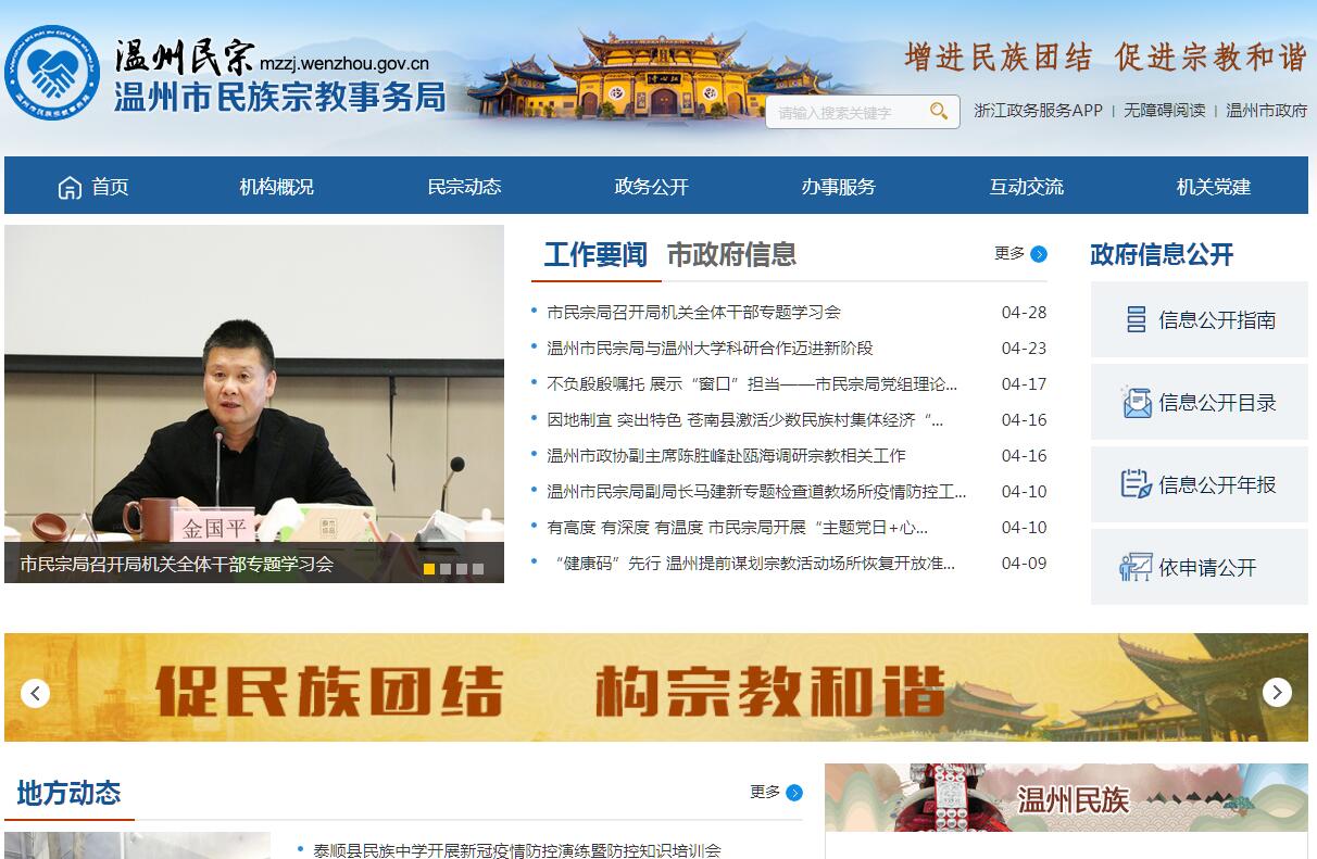 温州市民族宗教事务局主要职责:(一)贯彻执行关于民族宗教工作的方针政策和法律、法规、规章。开展民族宗教问题的调查研究工作,提出有关民族宗教工作的政策建议,承担有关民族宗教事务方面指导性意见的具体起草工作。(二)组织指导民族宗教政策和法律法规的宣传教育工作,对有关民族宗教政策和法律法规贯彻执行情况进行督促检查。(三)指导、监督全市少数民族地区法律、法规的贯彻实施,监督保障少数民族合法权益,协调处理民族关系中的重大事项,维护社会稳定。(四)拟订少数民族事业等专项规划,监督检查规划实施情况,参与拟订少数民族和民族地区经济社会相关领域的发展规划,促进建立和完善少数民族事业发展综合评价监测体系。(五)会同有关部门推进和协调经济发达地区与民族地区的对口支援。会同有关部门做好民族地区的扶贫工作。参与协调民族地区科技发展、对口支援和经济技术合作等有关工作。(六)研究少数民族和民族地区文化等社会事业方面的特殊问题并提出相关意见,配合有关部门处理相应事务。(七)指导县(市、区)开展城市民族工作,协调做好外来少数民族流动人口和在温新疆籍人员的服务管理工作。(八)依法履行宗教事务管理职责,依法保护公民宗教信仰自由和正常的宗教活动,维护宗教合法权益,促进宗教关系和谐。(九)指导各地民族宗教事务部门依法履行管理职能,处理宗教事务的重大事件。(十)推动宗教界人士进行爱国主义、社会主义、拥护祖国统一和民族团结的自我教育,坚持我市宗教发展的中国化方向,巩固和发展同宗教界的爱国统一战线。(十一)指导和督促宗教团体依法依章开展活动,支持宗教团体加强自身建设,帮助宗教团体培养、教育宗教教职人员,办好宗教院校。办理宗教团体需由政府解决或协调的有关事务。(十二)负责佛教、道教、伊斯兰教、天主教、基督教等五大宗教以外的宗教工作,调查研究并提出政策建议。(十三)负责民间信仰事务工作,指导各地民族宗教事务部门管理民间信仰事务,调查研究并提出政策建议。(十四)指导各地政府处理民族宗教方面的突发性事件和影响社会稳定的问题。推进实施民族宗教事务服务体系和民族宗教管理信息化建设。根据分工做好民族宗教领域的安全工作,协调有关部门履行民族宗教工作相关职责。(十五)组织全市民族宗教工作干部、少数民族干部和宗教教职人员培训工作。协助组织、统战工作部门做好少数民族干部的选拔、培养和使用工作,配合做好各级各类少数民族人才工作。(十六)组织协调本市民族宗教领域的对外交流活动。归口管理民族宗教方面的外事工作。支持和帮助宗教界开展对外和对港澳台友好交流活动并办理有关事宜。(十七)完成市委市政府交办的其他任务。