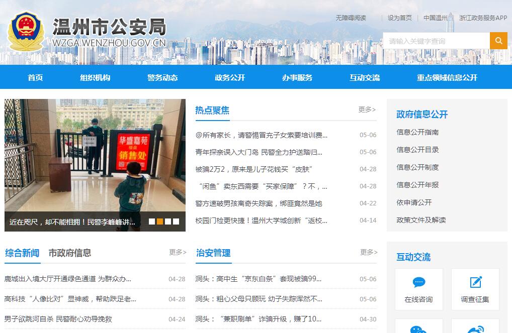 温州市公安局主要职责:(一)贯彻执行党和国家有关公安工作的方针、政策、法律、法规和市委、市政府、上级公安机关的指示;起草有关公安行政管理的规范性文件,经审议通过后组织实施;部署、指导、监督全市公安工作。(二)负责对影响社会稳定和社会治安的形势分析,研究提出对策措施;组织、指导110接处警等工作;组织、协调、指导全市反恐怖工作。(三)负责组织、指导国内安全保卫工作。(四)主管和指导经济、刑事犯罪等侦查工作,负责组织、协调特别重大案件和涉外、跨县(市、区)重大案件以及上级交办案件的侦查工作;组织、指导全市公安刑事科学技术工作。(五)指导、监督全市公安机关查处危害社会治安秩序行为,依法管理危险物品、特种行业和内河水域;负责组织、协调对严重危害社会治安秩序的重特大治安事件和突发性事件的处置工作,管理集会、游行、示威活动;组织、指挥公安特警队的处突防暴工作;负责对全市保安服务活动的监督管理工作;配合、协调城市管理与行政执法过程中行使相对集中行政处罚权的相关工作。(六)组织、指导全市公安基层基础工作,完善治安防范体系;依法管理户籍、居民身份证、流动人口;组织、指导对全市国家机关、社会团体、企事业单位和重点工程的治安保卫工作以及群众性治安保卫组织的治安防范工作。(七)负责中国公民出入境和外国人在中国境内居留、旅行的有关工作;承担口岸签证、签注工作。(八)指导全市公安武警边防部队的公安业务工作,指挥、调动本市区域(全市)的公安武警边防部队执行地方治安管理等公安任务。(九)负责本市行政区域内(全市)的消防监督管理工作;领导公安消防部队承担重大灾害事故和其他以抢救人员生命为主的应急救援工作。(十)负责组织、指导、监督对全市道路交通安全、交通秩序维护以及机动车辆、驾驶员管理工作;指导、监督本市行政区域内(辖区)高速公路的交通管理工作。(十一)按照规定权限,组织、指导计算机信息系统及互联网安全保护管理工作,组织、指导网络犯罪侦查。(十二)指导、监督全市看守所、拘留所、收容教育所和公安机关管理(所属)的强制隔离戒毒所的工作;管理市看守所、市拘留所、市收容教育所、市三垟强制隔离戒毒所。(十三)组织、指导全市公安法制工作;指导、监督全市公安机关执法活动;承办市劳动教养审批工作;承担行政复议、应诉、国家赔偿等案件的办理工作。(十四)组织实施对来温的党和国家领导人、重要外宾以及重大活动、重要会议的安全警卫工作。(十五)组织、协调、指导全市禁毒、缉毒工作。(十六)组织、指导全市公安科学技术和信息化工作;负责全市公安机关信息通信勤务保障工作的规划协调和组织指导;负责管理全市社会公共安全技术防范业务。(十七)指导、管理全市公安机关装备、被装、经费和基本建设等警务保障工作。(十八)领导全市公安消防、警卫部队建设,按规定权限协管公安消防、警卫部队领导干部以及对武警部队执行公安任务实施领导和指挥。(十九)组织、指导全市公安队伍建设,组织实施并指导全市公安宣传、教育、训练工作;按规定权限管理干部人事工作。(二十)按规定权限实施对全市公安机关及人民警察的监督;领导全市公安机关督察工作,组织、指导维护民警执法权益工作;查处或督办公安队伍重大违纪案件;组织、指导全市公安内部审计工作。(二十一)指导铁路、森林公安机构的业务工作。(二十二)承办市政府和上级公安机关交办的其他事项。