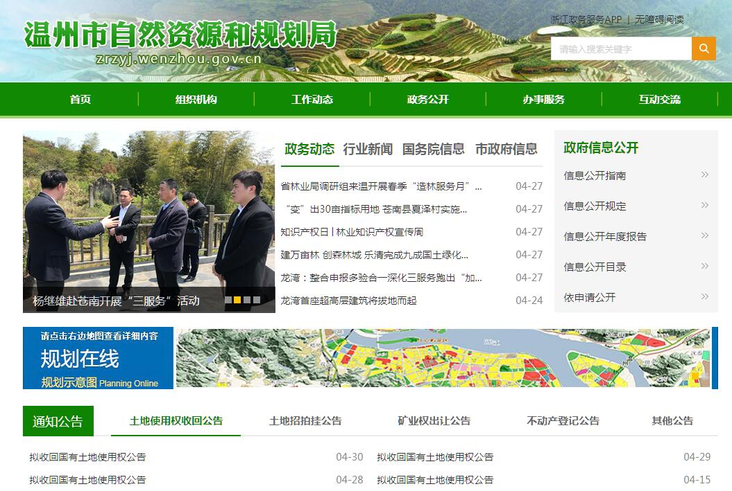 温州市自然资源和规划局主要职责:(一)履行全民所有土地、矿产、森林、湿地、水、海洋等自然资源资产所有者职责和所有国土空间用途管制职责。贯彻执行国家、省和市有关自然资源管理、国土空间规划和测绘地理信息管理的方针政策和法律法规,组织起草有关地方性法规、规章草案。(二)负责自然资源调查监测评价。完善自然资源调查监测评价的指标体系和统计标准,建立健全统一规范的自然资源调查监测评价制度。实施自然资源基础调查、专项调查和监测。负责自然资源调查监测评价成果的监督管理和信息发布。指导县(市)自然资源调查监测评价工作。(三)负责自然资源统一确权登记工作。制定各类自然资源和不动产统一确权登记、权籍调查、不动产测绘、争议调处、成果应用的制度、标准、规范。建立健全自然资源和不动产登记信息管理基础平台。负责自然资源和不动产登记资料的收集、整理、共享和汇交管理等。负责自然资源和不动产确权登记。承担全市重大自然资源权属和不动产登记权属争议调处工作。负责农村土地承包经营权确权登记管理。(四)负责自然资源资产有偿使用工作。建立全民所有自然资源资产统计制度,负责全民所有自然资源资产核算。编制全民所有自然资源资产负债表,拟订考核标准。制定全民所有自然资源资产划拨、出让、租赁、作价出资和土地储备、海岸线收储政策并组织实施,合理配置全民所有自然资源资产。负责自然资源资产价值评估管理,依法收缴相关资产收益。(五)负责自然资源的合理开发利用。组织拟订自然资源发展规划、战略和开发利用标准并组织实施。建立政府公示自然资源价格体系,组织开展自然资源分等定级价格评估,开展自然资源利用评价考核,指导节约集约利用。负责自然资源市场监管。组织研究自然资源管理涉及宏观调控、区域协调和城乡统筹的政策措施。(六)负责建立空间规划体系并监督实施。推动实施“一张蓝图、多规合一”,推进主体功能区战略和制度,组织编制并监督实施国土空间规划。开展国土空间开发适宜性评价,建立国土空间规划实施监测、评估和预警体系。组织划定生态保护红线、永久基本农田、城镇开发边界等控制线,构建节约资源和保护环境的生产、生活、生态空间布局。建立健全国土空间用途管制制度。组织拟订并实施全市土地、海洋等自然资源年度利用计划。负责土地、海域、海岛等国土空间用途转用工作。负责土地征收征用管理。(七)负责城乡规划管理工作。组织编制市区控制性详细规划工作。会同有关部门共同编制城乡规划中交通、市政等专项规划。负责建设用地、建设工程的规划许可和规划管理工作。拟订开展城乡规划管理等用途管制政策并监督实施。(八)负责统筹国土空间生态修复。牵头组织编制国土空间生态修复规划并实施有关生态修复重大工程。负责国土空间综合整治、土地整理复垦、矿山地质环境恢复治理、林业生态保护修复、海域海岛海岸线(港口岸线除外)整治修复和海洋生态修复等工作。牵头建立和实施生态保护补偿制度,制定合理利用社会资金进行生态修复的政策措施,提出重大备选项目。(九)负责组织实施最严格的耕地保护制度。牵头拟订并实施耕地保护政策,负责耕地数量、质量、生态保护。组织实施耕地保护责任目标考核和永久基本农田特殊保护。完善耕地占补平衡制度,监督占用耕地补偿制度执行情况。(十)负责组织编制地质灾害防治规划和防护标准并指导实施。组织指导协调和监督地质灾害调查评价及隐患的普查、详查、排查。指导开展群测群防、专业监测和预报预警等工作,指导开展地质灾害工程治理工作。承担地质灾害应急救援的技术支撑工作。承担全市地质管理工作,监督管理地下水过量开采及引发的地面沉降等地质问题。承担地质勘查的安全生产管理工作。(十一)负责矿产资源开发管理工作。负责矿业权管理,监督指导矿业权有形市场建设。会同有关部门承担保护性开采的特定矿种、优势矿产的调控及相关管理工作。负责矿产资源储量管理及压覆矿产资源审批。监督指导矿产资源勘查、开发利用和保护。(十二)负责造林绿化工作。指导森林资源的培育,指导、监督全民义务植树、造林绿化工作。负责林业有害生物防治、检疫工作。承担林业应对气候变化的相关工作。(十三)负责森林、湿地和陆生野生动植物资源的监督管理和动态监测与评价。负责林地管理,拟订林地保护利用规划并组织实施。指导公益林划定,负责公益林建设、保护和利用的监督管理,负责天然林保护工作,按分工负责古树名木保护工作。会同有关部门拟订湿地保护利用规划和相关标准,监督管理湿地的开发利用。指导国有林场建设和发展。(十四)负责监督管理各类自然保护地。拟订各类自然保护地发展规划、政策和相关标准并监督实施。负责各类自然保护地设立、调整、规划相关工作。(十五)负责推进林业改革相关工作。拟订深化集体林权制度、国有林场等重大改革意见并监督实施。拟订农村林业发展、维护林业经营者合法权益的政策措施,指导农村林地承包经营工作。指导林业帮扶、兴林富民相关工作。负责林业种苗监督管理。(十六)负责落实综合防灾减灾规划相关要求,组织编制森林火灾防治规划和