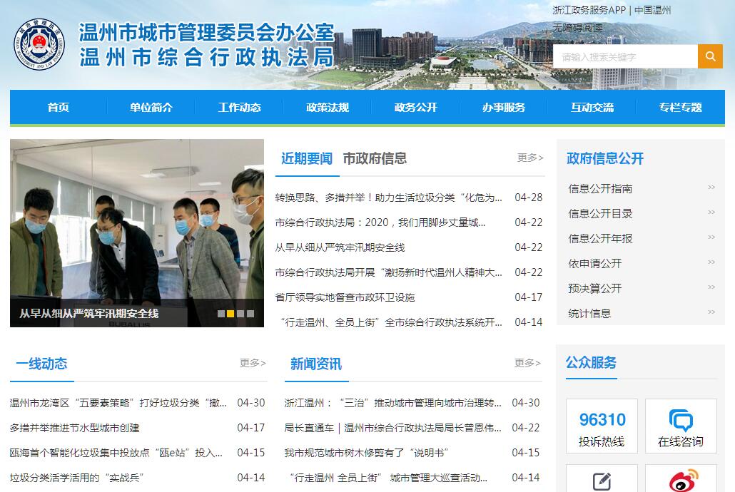 温州市综合行政执法局是市政府工作部门,挂温州市城市管理局牌子,为正县级。温州市综合行政执法局贯彻落实党中央、省委和市委关于综合行政执法和城市管理工作的方针政策和决策部署,在履行职责过程中坚持和加强党对综合行政执法和城市管理工作的集中统一领导。其主要职责是:(一)宣传、贯彻、执行国家和省市关于开展综合行政执法和城市管理工作的法律、法规、方针、政策。组织拟订有关综合行政执法和城市管理方面的规范性文件和管理标准,并组织实施。(二)制定城市管理发展战略、中长期发展规划和年度计划,并组织实施。参与城乡规划主管部门编制城市市容环卫、市政公用、园林绿化等各项专业规划,参与城市建设项目设计方案、初步设计的审查。(三)负责组织指导、统筹协调、监督检查、综合考评全市综合行政执法和城市管理工作。(四)负责行使市容环卫、城乡规划、园林绿化、市政公用、生态环境保护、市场监管(室外公共场所无照经营)、公安(侵占人行道、饲养动物干扰他人正常生活)、土地和矿产资源、建筑业、房地产业、人防(民防)、水行政、安全生产、石油天然气管道保护、教育管理等方面的法律、法规、规章规定的全部或部分行政处罚及相关行政监督检查、行政强制职权。综合行政执法的职权划转依据省政府批复,以市政府公告为准。(五)负责重大案件、跨区域案件查处和组织开展全市性重大综合行政执法活动和专项活动。承担市级直接管辖范围内的行政处罚案件查处,对县(市、区)综合行政执法部门行政不作为的行政处罚案件直接立案查处。(六)负责市属市容环卫、市政公用、园林绿化等基础设施的管理和相关的行政许可。参与财政部门编制综合行政执法和城市管理维护经费年度计划,并组织实施和监管使用。负责城市节约用水工作。组织协调城区防汛抗台及城管各类突发事件的应急处置工作。(七)负责制定智慧城管的总体规划、近期计划与远期计划。负责发现、收集和处置城市管理问题,监督、考评相关部门、各县(市、区)政府解决城市管理问题的情况。(八)完成市委、市政府交办的其他任务。