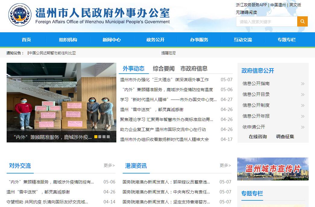 温州市人民政府外事办公室主要职责:(一)围绕全市经济社会发展和外事、港澳工作开展调查研究,为市委、市政府的外事、港澳工作决策提出意见和建议;研究制订外事、港澳工作政策和工作规划,并组织实施和督促落实。(二)归口管理全市外事、港澳工作;负责协调处理本市重大涉外和涉港澳事务;做好中央、省有关部门需要我市配合的涉外和港澳工作。(三)围绕市委、市政府中心工作,指导、推动涉外和港澳在经济、科技、教育、文化、人才等方面的合作与交流。(四)负责接待来我市访问或进行公务活动的国宾、党宾,外国驻华使领馆官员,国(境)外其他官方、知名企业、机构高层人员;统筹安排办理市级领导的对外交往事宜;指导全市重要外事活动的礼宾接待工作。(五)归口管理各国驻华使领馆官员在温活动;统筹安排和管理我市与外国驻华使领馆的交往活动;负责协调处理突发性涉外事件;负责协调处理我市在境外公民和机构的领事保护工作;协调境外非政府组织在温活动管理;协助市有关部门对在温外籍人员的管理工作。(六)负责我市与外国友好城市、友好交流关系城市的日常联络和发展新友城工作,管理我市与外国的各类结好工作。(七)负责全市因公出国、赴港澳任务审核、审批、报批和管理工作;负责邀请国外、港澳相关人员来访的审核与报批工作;办理全市因公出国人员护照、因公赴港澳人员通行证和代办外国签证(APEC商务旅行卡)工作;督促、协调有关部门对因公出国(境)人员进行外事政策和纪律教育;负责领事认证工作。(八)配合和协助市相关部门做好对外宣传和群众性外事纪律教育工作;提供有关国际形势、对外政策、重大国际问题和全市外事工作的宣传材料;协助做好外国记者、港澳记者来温采访的管理与服务工作,协同审核重要涉外报道;协调做好涉温外媒舆论引导工作。(九)负责我市与中央人民政府驻港澳联络办、外交部驻港澳特派员公署以及港澳特区政府、重要民间团体的联系和接待工作;负责管理和指导我市与香港、澳门因公往来的有关事务。(十)归口管理我市民间对外友好工作,统筹协调、组织指导全市公共外交活动和民间国际交流活动,负责国外重要民间团体、知名人士的联系和接待工作。(十一)负责全市外事干部、涉外人员的教育培训工作,协助纪检监察和有关部门监督检查外事纪律、保密制度的执行情况,协助处理违反外事纪律和保密规定的重大案件。(十二)承担市委外事工作委员会办公室及其他涉外工作领导协调机构办公室的日常工作。(十三)承办市委、市政府交办的其他事项。