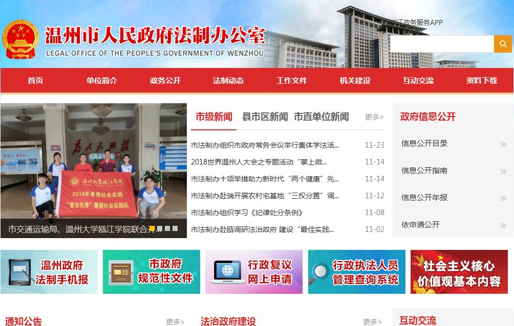 根据《中共浙江省委办公厅浙江省人民政府办公厅关于印发〈温州市人民政府机构改革方案〉的通知》(浙委办〔2011〕36号)精神,设立温州市人民政府法制办公室。市政府法制办公室是主管综合性法制工作事务的市政府工作部门。其主要职责:(一)统筹协调全市规范性文件制定工作;提出市政府制定规范性文件的工作计划建议,并组织实施;负责市政府规范性文件的审核、清理、评估、解释工作。(二)承办国家和省有关法律、法规、规章、规范性文件草案的征求意见工作。(三)负责市政府规范性文件向省政府和市人大常委会的备案工作;审查下级政府、市政府各部门报送备案的规范性文件,并提出审查意见。(四)负责市政府行政复议、行政应诉和行政赔偿案件的办理;指导全市行政复议、行政应诉和行政赔偿案件的办理工作。(五)承担行政执法监督的具体工作;负责推行行政执法责任制;指导行政执法部门规范行政执法行为;负责重大具体行政行为的备案审查;负责行政执法投诉案件的办理工作。(六)负责行政执法主体资格审核和年检,组织全市行政执法人员的综合法律知识培训。(七)牵头组织全市行政调解工作。(八)负责市政府法律顾问事务;承办市政府重大决策、重要行政措施出台前的合法性审查,代理市政府民商事诉讼事务。(九)组织、协调、指导、监督全市依法行政工作。(十)负责联系市政府与市人大常委会和市政协之间的法制工作事项;对下级政府和市政府各部门政府法制工作进行业务指导;指导全市仲裁工作。(十一)承办市政府交办的其他事项。