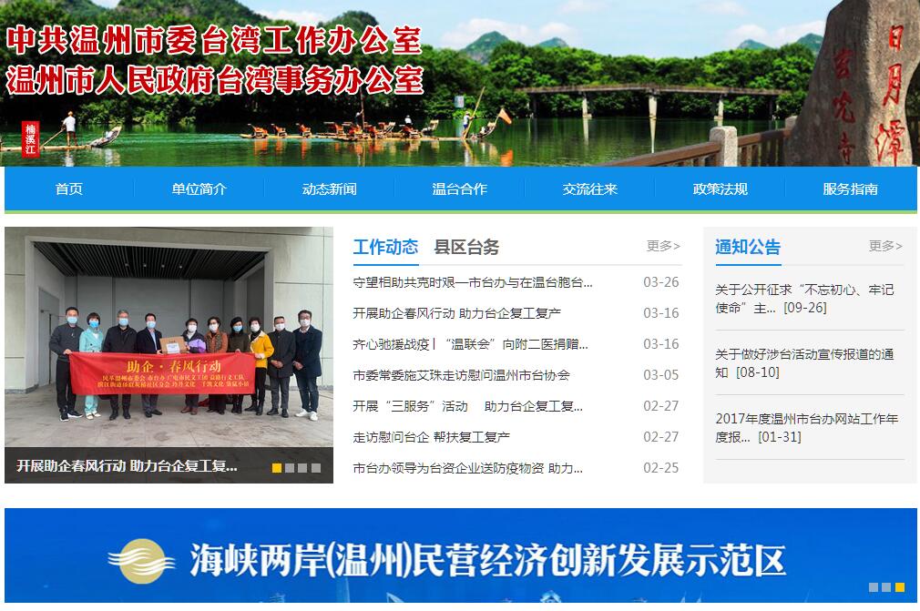 | 网站简介: 温州市人民政府台湾事务办公室是温州市人民政府主管台湾工作的机构。其主要职责:(一)贯彻执行党中央、国务院、省委、省政府对台工作方针政策和市委、市政府涉台工作部署;组织、指导、管理、协调市级各部门对台工作;指导各县(市、区)台办工作;督促、检查各县(市、区)、市级各部门贯彻执行中央、省、市对台工作方针、政策的情况;拟定我市涉台事务的有关规定和实施办法。(二)会同有关部门统筹协调和指导对台经贸工作和两岸文化、教育、体育、卫生、科技等领域的交流与合作,以及温台人员往来、考察等工作。(三)负责对台宣传和涉台教育工作。(四)做好来温和在温台胞(包括沿海台湾渔民)的接待、管理工作。(五)了解台湾情况,调查研究我市对台工作,适时提出对台工作的对策和建议。(六)组织、指导对发生在我市的重大涉台突发事件的处理。(七)承办市委、市政府和上级台办交办的其他有关事项。 |