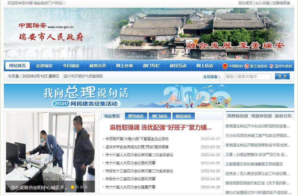| 网站简介: 瑞安地处浙江东南沿海,是浙江省重要的现代工贸城市、历史文化名城和温州大都市区南翼中心城市,陆域面积1350平方公里,海域面积3037平方公里,下辖9镇12街2乡。关于瑞安市情可以用“一千四百”来概括:“一千”就是瑞安是一座具有1781年历史的千年古县,素有“理学名邦”“东南小邹鲁”之美称。“四百”就是户籍人口超百万,目前达124.64万人,常住人口达150万人;经济实力稳居全国百强县中上游,在2019年全国综合实力百强县市排名第25位,绿色发展百强县市排名第8位;财政总收入超百亿元,2019年财政总收入125.2亿元;建成区规划面积超过一百平方公里,在全国新型城镇化质量百强县市排名第16位。 |