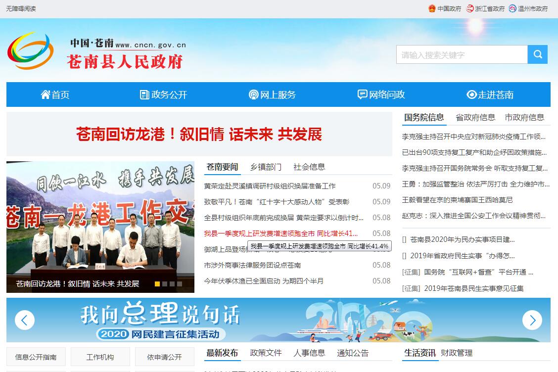 苍南县位于浙江省的沿海最南端、濒临东海,与宝岛台湾遥遥相望。隶属于中国浙江省温州市。历史上一直属平阳县辖域,于1981年独立设县。因地处玉苍山之南,取县名为苍南。地理坐标为北纬27°30′,东经120°23'。素有浙江“南大门”之称,东与东南濒临东海,西南毗连福建省福鼎市,西邻泰顺县,北与平阳、文成两县接壤。苍南属亚热带海洋性季风气候,冬暖夏凉,资源丰富,特产富饶,并以水产、矿产、旅游三大资源和四季柚、甜橙、茶叶三大名特优产品最具开发前景,尤其是长1800米的渔寮大沙滩为我国沿海大陆聚沙滩所罕见。苍南城区距温州市区81公里,距离省会杭州432公里,104国道自北而南穿越城区。地理位置和交通条件十分优越。年平均气温18℃,年平均降水量1670.1毫米。总面积1261.08平方公里,海域面积3.72万平方公里,海岸线长155公里。现辖17镇、2个民族乡。县政府驻灵溪镇人民大道。2010年第六次全国人口普查,苍南县常住人口为118.46万人,同第五次全国人口普查2000年11月1日零时的116.76万人相比,10年共增加1.70万人,增长1.46%,年平均增长率为0.15%。2018年,全县生产总值(GDP)560.6亿元,比上年增长7.2%。其中,第一产业增加值33.0亿元,增长1.5%;第二产业增加值201.2亿元,增长3.9%;第三产业增加值326.3亿元,增长10.3%。按常住人口计算,人均地区生产总值44975元,增长8.3%。国民经济三次产业结构为5.9:35.9:58.2,第三产业比重比上年提高1.6个百分点。