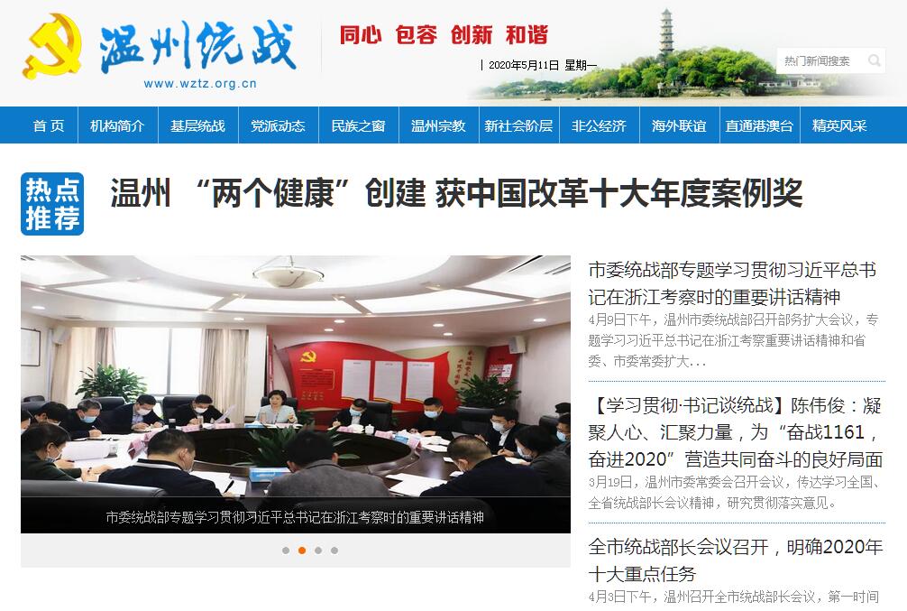 中共温州市委统战部是中共温州市委主管统战工作的职能部门。其具体职责是:(一)组织贯彻执行中央和省市委关于统一战线的方针、政策、指示、决议,调查研究统一战线工作新情况新问题,及时向市委反映情况,提出开展统战工作的意见和建议。负责对全市重大统战活动进行协调,并对贯彻落实各项统战方针、政策进行监督检查,加强对重大问题的协调处理。(二)负责联系各民主党派和无党派代表人士,及时通报情况,反映他们的意见和建议;协助市委贯彻党领导的多党合作和政治协商制度及对民主党派的方针、政策,发挥市级各民主党派参政议政和民主监督作用;支持、帮助市级各民主党派开展工作,加强自身建设,选拔、培养新一代代表人物。(三)负责调查研究有关民族、宗教工作的方针、政策贯彻落实问题;协调全市宗教专项工作;联系少数民族和宗教界的代表人物;协助有关部门做好少数民族干部的培养和举荐工作;会同有关部门反对和抵制国外宗教势力的渗透活动,维护政治社会稳定。(四)负责开展以祖国统一为重点的港澳台和海外统战工作;联系港澳和海外有关社团及代表人士;按照分工做好与台湾各界人士的联络工作;做好台胞、台属的有关工作。联系出国留学人员和学成回国人员的工作。(五)负责党外人士的政治安排;会同有关部门做好培养、选拔、推荐党外人士担任政府及其部门和司法机关领导职务的工作;做好党外后备干部和新的代表人物队伍的建设工作;协助民主党派市委会、市工商联等团体做好干部管理工作。(六)负责联系海内外工商界社团和代表人士,开展经济领域的统战工作;受市委委托领导市工商联党组,指导工商联工作;调查、研究并反映我市非公有制经济代表人士的情况,协调关系,提出政策建议;联系非公有制经济代表人士,做好团结教育工作。(七)掌握党外知识分子的情况,反映他们的意见,协调关系,提出政策建议;联系并培养党外知识分子代表人物,会同有关部门做好政治、生活待遇的安排。(八)负责统一战线的宣传工作。协调统战系统宣传活动,协同有关部门开展海外统一战线的宣传工作。(九)主管温州海外联谊会、统战理论学会,加强建设,发挥作用。(十)负责指导各县(市、区)党委统战部门工作,协调各有关部门的统战工作;指导市侨联、台联、黄埔同学会等有关团体的工作;负责和组织实施市社会主义学院的工作;联系在温的省文史馆员工作,并在人事安排和贯彻统战政策方面进行指导。(十一)完成市委和省委统战部交办的其他任务。
