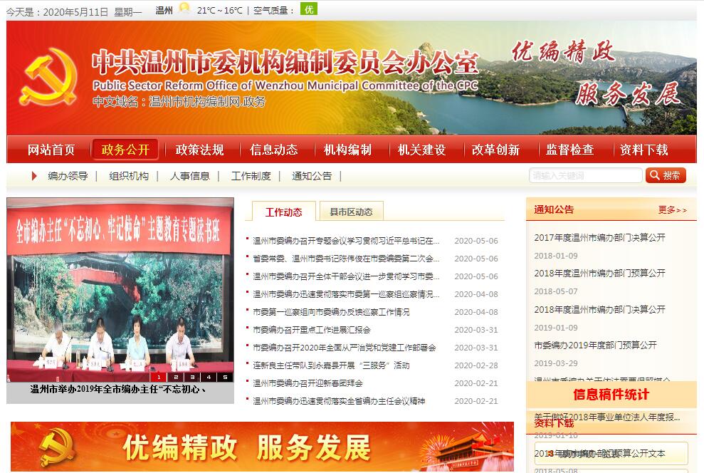 温州市机构编制委员会办公室主要职责:(一)贯彻执行党和国家、省有关行政管理体制、机构改革和机构编制管理的法律、法规、政策;起草有关机构编制管理的规范性文件。(二)研究制订全市行政管理体制和机构改革的总体方案,组织实施市级党政机构改革方案;审核县(市、区)党政机构改革方案,指导、协调全市各级行政管理体制改革、机构改革和机构编制管理工作。(三)协调市委、市政府各部门的职能配置及其调整;协调市委各部门之间、市政府各部门之间、市委各部门与市政府各部门之间,以及市直各部门与县(市、区)之间的职责分工。(四)审核市委、市政府各部门以及部门管理机构、市政府派出机构、议事协调机构的办事机构的机构设置、人员编制和领导职数;审核县(市、区)党委、政府工作部门的设置与调整;审核全市各级行政编制、专项编制总额。(五)审核市人大、政协、法院、检察院机关以及民主党派、人民团体机关的机构设置、人员编制和领导职数。(六)参与全市事业单位分类改革;拟订全市事业单位机构改革方案;协同市级有关部门推进各类事业单位管理体制改革;拟订事业单位机构编制管理办法及编制标准并组织实施;审核市委、市政府直属事业单位以及市直各部门所属事业单位的机构编制;审核县(市、区)相当于副科级以上事业单位的机构规格;审核县(市、区)承担行政职能的事业单位的类别和编制;参与事业单位参照公务员法管理的审核、报批工作;指导并协调县(市、区)事业单位机构改革和编制管理工作。(七)负责市级及指导协调县(市、区)各类开发区、功能区行政管理体制改革和机构编制管理工作。(八)协助管理省以下垂直管理系统设在我市的行政、事业单位的机构编制工作。(九)监督检查行政管理体制和机构改革以及机构编制政策、法规的执行情况;依法查处违反机构编制管理政策法规的违规违纪行为。(十)负责组织实施全市机关、事业单位机构编制实名制管理工作;负责市级机关、事业单位财政统发工资的人员编制审核工作;负责全市机构编制统计和机构编制数据库的管理工作。(十一)贯彻执行国务院颁发的《事业单位登记管理暂行条例》,监督指导全市事业单位登记管理工作。(十二)负责市级及指导协调县(市、区)机关事业单位编制外用工范围和总量控制。(十三)受市委、市政府委托,负责市级国资营运公司机构设置和定岗定员管理工作。(十四)承担市委、市政府和市机构编制委员会交办的其他工作。