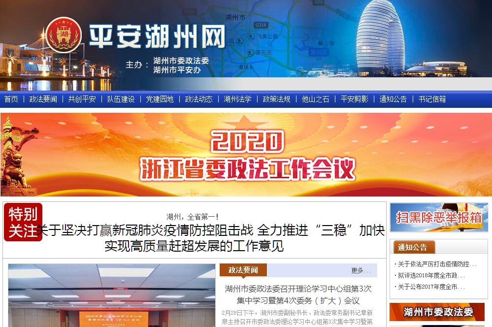 平安湖州网由湖州市委政法委员会主办。湖州市委政法委员会主要职责:(一)贯彻执行党的路线、方针和政策,统一全市政法各部门和综合治理成员单位的思想行为。 (二)根据上级党委政法委员会、610办公室、维护稳定工作领导小组办公室和社会治安综合治理委员会办公室,以及市委、市政府的部署,研究制定一定时期内政法、维护社会稳定、反邪教和社会治安综合治理工作规划和计划,并督促贯彻落实。 (三)支持政法各部门依法行使职权,组织查处非法干涉、干预和阻碍政法机关依法执行公务事件;指导和协调政法各部门相互制约、共同配合,督促和推动大案要案的查处,研究并协调处理有争议的重大、疑难案件。 (四)负责对政法各部门执行法律法规和党的方针政策的情况进行监督检查,督促政法各部门纠正和处理执法过程中的违法违纪行为,协助有关部门查处政法部门领导的违法违纪案件。(五)综合协调维护社会稳定工作。及时掌握、准确研判和处理涉及稳定工作的动态信息,组织实施不稳定因素排查化解工作,督促有关责任单位做好维护社会稳定相关工作。(六)牵头协调并落实防范和处理邪教的各项工作任务。(七)组织、协调社会治安综合治理工作,研究制定并督促落实社会治安综合治理的有关政策和措施,推动“平安湖州”建设。(八)研究和指导政法队伍和政法部门领导班子建设;协助和配合市、县、区党委及有关部门管理政法部门的有关领导干部;组织指导政法系统干部、职工教育培训和管理工作。(九)负责协调法医鉴定工作,监督、指导市人身伤害鉴定委员会和市精神病鉴定委员会对有关案件进行鉴定的工作。(十)对全市政法系统内的企业进行宏观管理、指导和监督,负责对政法系统内企业进行设立前审核。(十一)承办市委、市政府和上级党委政法委员会、610办公室、维护稳定工作领导小组办公室、社会治安综合治理委员会办公室交办的其他事项。