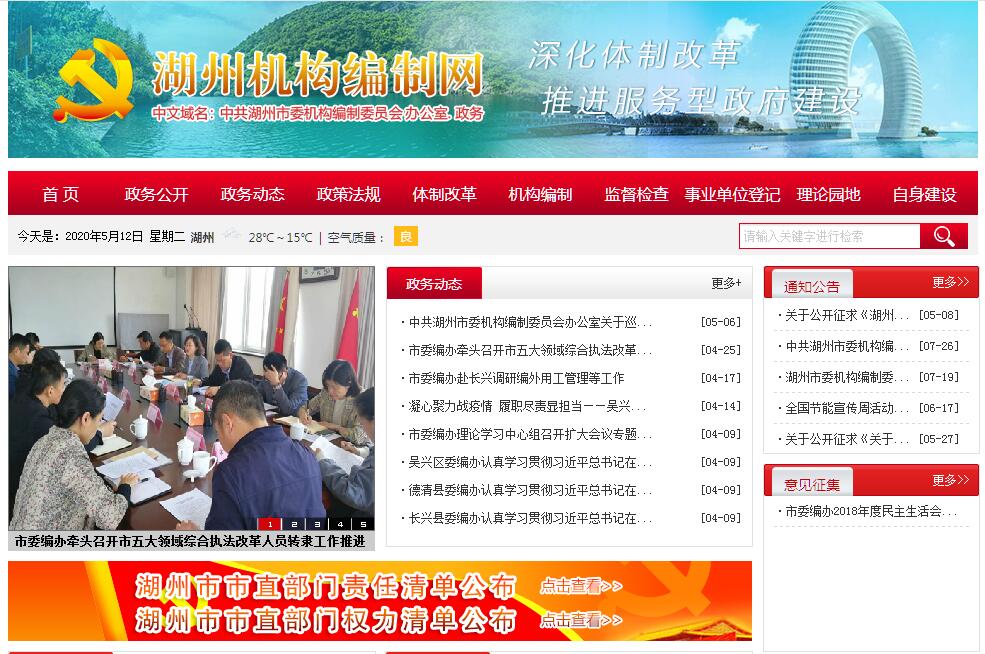 湖州市机构编制委员会办公室是市机构编制委员会的常设办事机构,在市机构编制委员会的领导下负责全市行政管理体制和机构改革以及机构编制的日常管理工作,既是市委的工作机构,又是市政府的工作机构,列市委机构序列。其主要职责如下:(一)贯彻执行党和国家有关行政管理体制和机构改革以及机构编制管理的法规、政策;起草有关机构编制管理的规范性文件。(二)研究拟订全市行政管理体制和机构改革的总体方案,组织实施市级党政机构改革方案,审核下级党政机构改革方案,指导、协调全市各级行政管理体制改革、机构改革和机构编制管理工作。(三)审核市委、市政府各部门及部门管理机构、市政府派出机构、议事协调机构的办事机构的职能配置、机构设置、人员编制和领导职数,协调市级党政部门之间的职责分工及与下级党政部门之间的事权划分;审核市人大、政协机关,市审判、检察机关,市各民主党派和工商联机关,以及市人民团体和群众团体机关的职能配置、机构设置、人员编制和领导职数;审核下级党政机关工作机构的设置与调整;审核全市各级各类行政编制总额。(四)研究拟订全市事业单位管理体制和机构改革方案;审核市管事业单位的机构编制;审核县(区)行政类事业单位的类别和编制,以及相当于副科级及以上事业单位的机构规格,指导并协调县(区)事业单位机构改革和编制管理工作;参与事业单位分类改革和审核事业单位参照公务员法管理工作。(五)贯彻执行机构编制实名制管理办法;负责全市机构编制统计和机构编制数据库的管理工作;负责机关、事业单位财政统发工资的人员编制审核。(六)监督检查行政管理体制和机构改革以及机构编制法规、政策的执行情况,依法查处违反机构编制纪律行为。(七)贯彻执行《事业单位登记管理暂行条例》及相关法规政策,监督指导事业单位登记管理工作;监督指导全市行政、事业机构和社会团体、国有企业的政务和公益中文域名注册管理工作。(八)指导协调全市机关事业单位编外用工的范围和总量控制;会同财政部门审批市级机关、市管事业单位编外用工的数额。(九)完成市委、市政府和市机构编制委员会交办的其他事项。