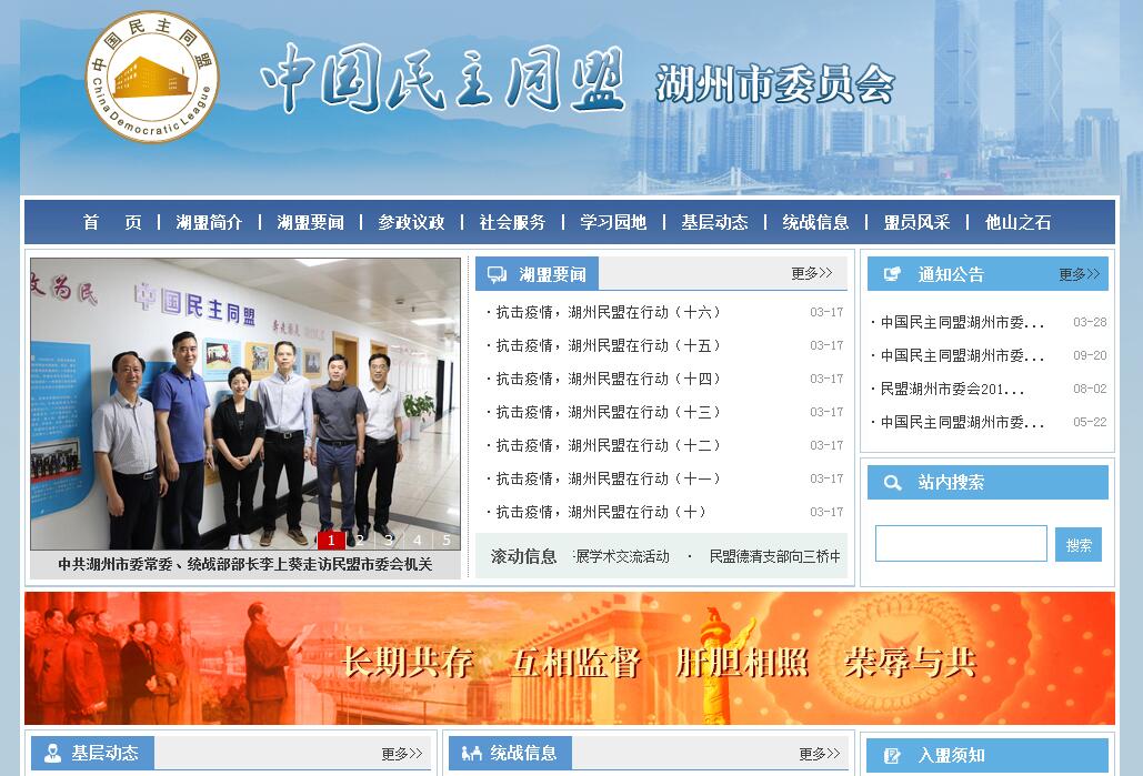中国民主同盟(简称民盟)湖州地方组织于1980年开始筹建,1980年12月30日,民盟浙江省委批准成立民盟湖州小组。1982年11月28日,民盟湖州支部成立。1983年10月22日,民盟湖州市筹备委员会成立。1985年6月16日,民盟湖州市第一次盟员大会在湖州召开,选举产生由7名委员组成的第一届市委员会。1988年12月举行第二次盟员大会,选举产生由9名委员组成的第二届市委员会。1992年5月15-17日,民盟湖州市第三次全体盟员大会在湖州宾馆召开,100名盟员出席了会议,选举产生了由7名委员组成的第三届市委会。吴鸣皋为名誉主委,何仲洛任主委,徐重庆任副主委兼秘书长。市委会下设办公室,基层组织有民盟湖中、一中、三中、文艺、师专、进修、师范、长兴等8个支部,共有盟员126人。1997年2月14-16日,民盟湖州市第四次盟员代表大会在湖州召开,80名盟员代表出席了大会,选举产生了由7名委员组成的第四届委员会。吴鸣皋为名誉主委,徐重庆为顾问,何仲洛为主委,敖操廉、张国宪、唐昕为副主委,张国宪兼任秘书长。市委会下设办公室,基层组织有民盟湖中、一中、三中、文艺、中专、师专、进修、师范、长兴中学、长兴科技、机关、医卫等12个支部,共有盟员166人。2001年6月11-13日,民盟湖州市第五次盟员代表大会在湖州召开,98名盟员代表出席了大会,选举产生了由7名委员组成的第四届委员会。吴鸣皋、何仲洛为名誉主委,唐昕为顾问,敖操廉为主委,张国宪、竺鸰、虞利民为副主委,张国宪兼任秘书长。市委会下设办公室,基层组织有民盟湖中、一中、三中、文艺、中专、师院一,二,三、长兴中学、长兴科技、机关、医卫、教育等13个支部,共有盟员204人。2002年11月27日,盟市委召开市委会,选举夏平为副主任委员,并接受敖操廉同志辞去主委职务(因工作调动原因)的报告。2003年3月20日,盟市委召开五届十二次会议,补选夏平为民盟湖州市第五届委员会主任委员。2006年8月23-25日,民盟湖州市第六次盟员代表大会在湖州召开,117名盟员代表出席了大会,选举产生了由11名委员组成的第六届委员会。夏平为主委,竺鸰、虞利民、李雪华为副主委,李雪华兼任秘书长。市委会下设办公室。 目前,基层组织有民盟湖中、一中、三中、十一中、文艺、中专、师院一、师院二、师院三、长兴文教、长兴科技、机关、医卫、教育、南浔等15个支部及吴兴、长兴、师院三个总支,共有盟员265人。盟员在民盟浙江省委会任职的有:何仲洛主委担任民盟浙江省委第七、第八届委员;夏平主委担任民盟浙江省委第九、第十届委员。