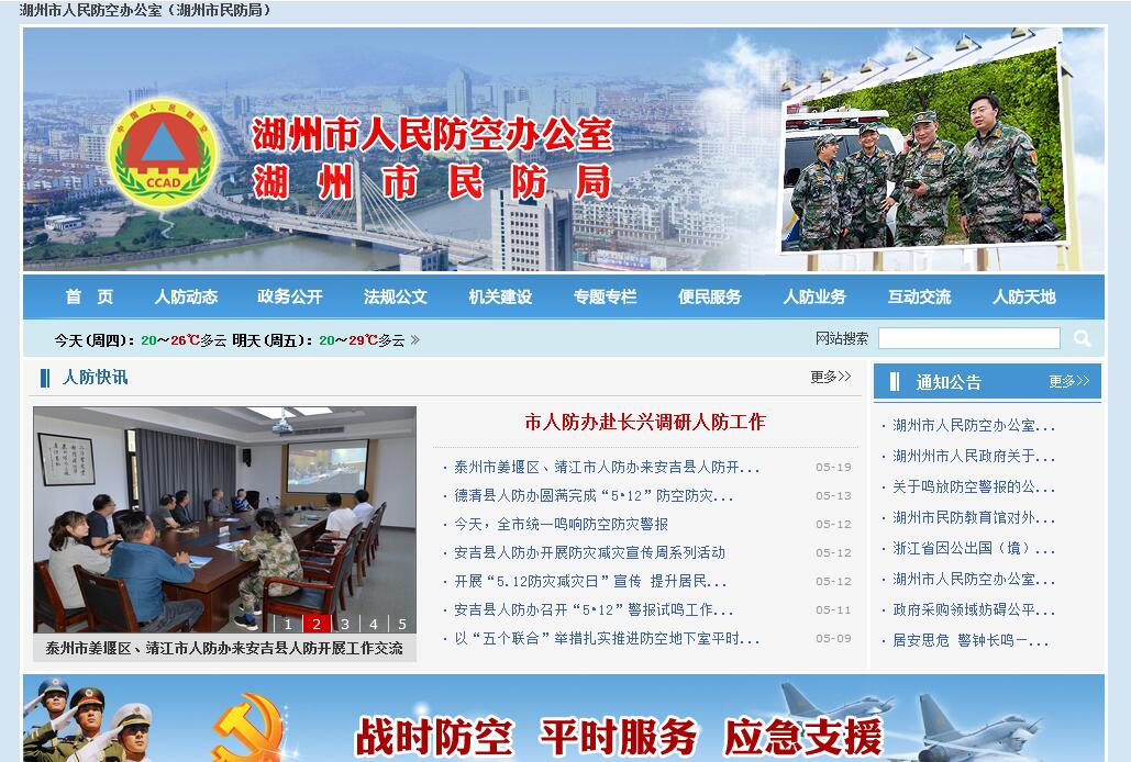 湖州市人民防空办公室(民防局)主要职责:(一)贯彻国家和省人民防空工作的政策和法律法规,拟订并组织实施人民防空地方规范性文件;对贯彻实施人民防空法律、法规的情况进行监督检查;依法对城市建设中人民防空要求落实情况进行督促和检查。(二)根据国民经济和社会发展规划及国防建设需要,负责编制市本级人民防空总体规划和工程、通信、警报建设专项规划,参与编制地下空间规划。(三)组织拟订市本级人民防空行动方案和各项保障方案,负责人口疏散体系建设,组织开展综合性演练;指导、监督城市重点目标单位制定防护方案并落实防护措施。(四)牵头拟订《突发公共事件人员防护保障行动方案》,协调各成员单位工作,落实人员防护行动。(五)组织市区人民防空工程建设;负责投资规模在600万元以下的人民防空工程项目建议书、可行性研究报告、初步设计、施工图设计审批;办理人防工程竣工验收许可;负责兼顾人防要求的地下空间开发审批;负责人防工程改造、拆除的审批;负责人防工程平时开发利用和战时平战转换工作,并承担相应责任。(六)组织市区人民防空指挥工程、公用的人员掩蔽工程和疏散干道工程的易地修建、维护管理和开发利用;指导、监督单位人防工程的维护管理工作。(七)负责市区人民防空通信、警报网的建设与管理;依法落实人民防空警报试鸣制度,指导县、区通信警报建设和防空警报试鸣工作;负责中心城区人防警报设施拆除、迁移审批。(八)指导全市组建和训练通信、防化防疫、医疗救护、抢险抢修、消防、治安、运输等防空专业队伍;指导、协调市级有关应急工作主管部门做好管理人员以及专业救援队伍的业务培训;指导人民防空重点镇人防(民防)专业队伍建设;组织人民防空干部和志愿者及群众的教育培训。(九)负责制定市本级人民防空宣传教育计划,并纳入国防和普法教育,组织开展宣传教育活动;指导协调市级有关应急工作主管部门做好突发公共事件中人员防护、避灾避险、自救互救等常识的宣传教育工作。(十)依法筹集和管理人民防空建设经费,执行人民防空财务管理规定和会计制度;负责人民防空国有资产的保值增值和内部审计,监督检查县区人民防空经费使用情况。(十一)战时根据市委、市政府和军事指挥机构的决定,发布人民防空的有关命令和指示,及时开设指挥所和指挥中心,保障有效指挥。(十二)承办市委、市政府、湖州军分区交办的其他事项。
