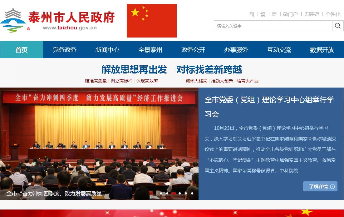 泰州(Taizhou),简称“泰”,江苏省地级市,位于江苏省中部。南部濒临长江,北部与盐城毗邻,东临南通,西接扬州。全市总面积5787.26平方千米,其中陆地面积占77.85%,水域面积占22.15%。市区面积1567.13平方千米。泰州有2100多年的建城史,秦称海阳,汉称海陵,州建南唐,文昌北宋。南唐时(公元937年)为州治,取“国泰民安”之意,始名泰州。泰州人文荟萃、名贤辈出,“儒风之盛,素冠淮南”。王艮、刘熙载、施耐庵、郑板桥、梅兰芳是泰州文化艺术史上的杰出代表。泰州是承南启北的水陆要津,为苏中门户,自古有“水陆要津,咽喉据郡”之称。700多年前,马可·波罗游历泰州,称赞“这城不很大,但各种尘世的幸福极多”。泰州所辖县市(区)全部建成国家级生态示范区、全国百强县,同时泰州也是全国文明城市、国家环保模范城市、国家园林城市、中国优秀旅游城市、全国科技进步先进市、第一批国家农业可持续发展试验示范区。2017年中国地级市全面小康指数排名第42。泰州市人民政府门户网站,始建于1999年,是江苏省泰州市政府在互联网上发布信息、公开政务、提供服务的总平台,是政府与公众交流的总窗口。为推动政府职能转变、提高行政效能、方便基层和群众办事,2008年6月网站在原来基础上进行了改版升级。新版泰州政府门户网站,着力体现时代特征和泰州特色,着力满足社会和公众需求,着力强化便民服务,着力推进政府管理创新,整体内容设计分信息服务、网上办事、互动交流三个功能版块。信息服务突出信息的权威性、全面性、及时性,发挥对外宣传作用;网上办事突出行政权力阳光运行,发挥网上服务大厅作用;互动交流突出政府与公众无碍障沟通,反映民情民意民声,便于政府与公众互动交流,更有效地联系群众接受监督、服务公众。