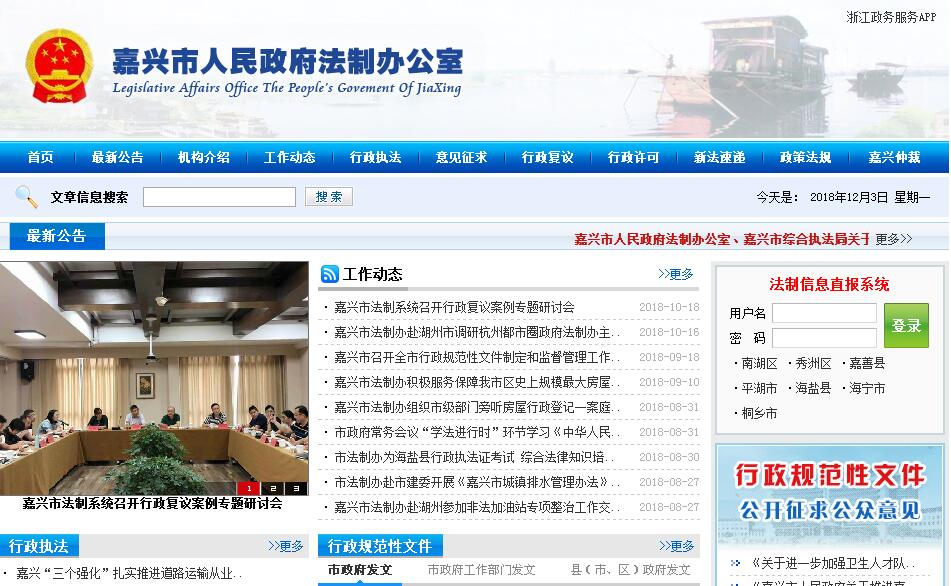 嘉兴市人民政府法制办公室作为协助市政府领导处理市政府日常工作的机构,承担的市政府法制工作:1.调查研究依法行政和政府法制建设中出现的新情况、新问题,提出推进依法行政的具体措施和工作建议。协助市长办理法制工作事项。负责政府法律顾问工作。2.统筹安排政府立法工作,负责起草或组织起草重要的政府规章草案,负责政府立法项目草案的审查,承办市政府规章的立法解释工作。3.负责市政府、市政府办公室规范性文件和市政府重大行政决策的合法性审查工作;负责各县(市、区)政府、市政府各部门的行政规范性文件及重大具体行政行为的备案审查工作;办理市政府行政合同的审查工作;承办公民、法人及其他组织对政府行政规范性文件的异议处理;指导行政规范性文件清理工作。4.研究行政立法、行政诉讼、行政复议、行政赔偿、行政处罚、行政许可、行政收费、行政执行等涉及政府行为共同规范的法律、法规、规章实施以及行政执法中带有普遍性的问题,向市政府提出完善制度和解决问题的意见,拟订有关配套制度和措施;指导、监督全市行政调解工作。5.承办市政府的行政复议、行政应诉和行政赔偿案件;指导、监督全市的行政复议、行政诉讼、行政赔偿工作;负责全市行政复议、行政应诉、行政赔偿案件的统计工作。6.组织实施全市推进依法行政工作,协调依法行政工作中的有关问题;负责行政执法主体资格的审查、认定和行政执法证件的审核管理;组织实施行政执法责任制,负责全市行政执法监督工作,协调部门之间在行政执法中的矛盾和争议;负责处理行政执法投诉;参与研究推进行政执法体制改革工作。7.组织开展政府法制理论研究和政府法制咨询、服务工作;做好法律、法规、规章及政府法制的宣传工作;指导、监督嘉兴仲裁委员会秘书处开展工作。8.负责市全面推进依法行政工作领导小组办公室的日常工作;组织实施依法行政(行政执法责任制)工作评议考核;负责全市行政执法、行政复议和行政应诉、政府法制工作人员的培训。
