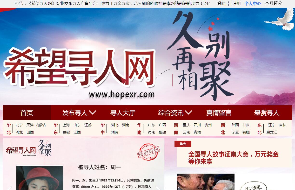 希望寻人网,为了服务广大走失人群,建立希望寻人网寻人寻亲平台,帮助更多人找到亲人朋友,通过希望寻人网的努力,让希望渺茫的寻人寻亲之路,变成充满希望的温暖回家路。希望寻人网(www.hopexr.com)是为广大寻人寻亲求助者独立搭建的最专业的寻人信息发布平台,也是目前国内寻人寻亲领先门户网站。中国希望寻人网长期致力于为离散破碎的不幸家庭寻亲和寻找自己亲生父母的流离失踪者提供寻家支援,旨在促进更多的失散家庭亲人团聚、破镜重圆。“中国希望寻人网”为了掌握走失人员的整体情况,网站负责人组织课题组通过文献研究、机构访谈、统计数据分析、电话家庭问卷调查等方式进行数据统计。中国希望寻人网将智力残疾、精神残疾以及年老体弱等易走失人员的照片、监护人和所在辖区社区负责人等资料输入中国希望寻人网数据库,救助站通过这一信息平台,能够快速确定易走失人员身份,送回家中,一改过去被动工作局面。亲人期盼的眼神是我们前进的最强动力。通过这一方式,自去年6月,中国希望寻人网建立的易走失人员信息平台正式运行以来,已录入超过数万余份易走失人员信息。截至目前,有数百位走失、失联人员通过这一平台第一时间被送回家中。中国希望寻人网开展“互联网+救助寻亲”创新模式,极大地提高了救助寻亲效率,帮助走失人员今早与家人团聚,同时也有利于缓解照料安置滞留受助人员的工作压力,督促受助人员家属继续履行抚养、扶养和赡养义务。