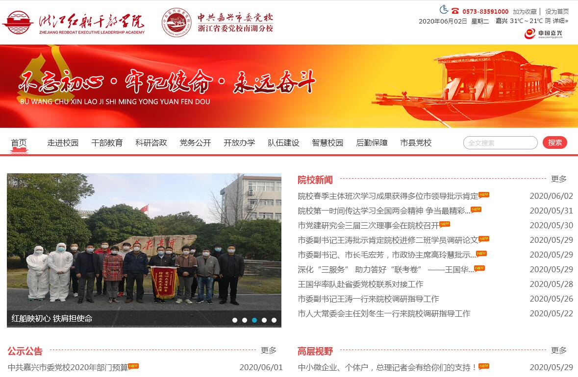 浙江红船干部学院是由中共浙江省委主办、中共浙江省委组织部主管、中共嘉兴市委协助管理的省属事业单位,与中共嘉兴市委党校合署办公。学院座落于党的诞生地浙江省嘉兴市,红船旁南湖边,位于嘉兴市云东路1129号。校园由云东校区和文昌校区组成,共占地面积127亩,建筑面积7万余平方米,现有教职工100余名,同时,面向全国聘请一批具有较高学术造诣和社会影响的专家学者为学院特聘教授。校园设施齐全、功能完备,拥有现代化的教学设施、图书馆、文体馆和学员公寓,可同时容纳800多名学员在校培训。以绿色生态为理念的景观布局,以现代信息化为基础的智慧校园,以红色文化、传统文化、干部教育文化、浙江地域文化、江南特色文化、时代创新文化为主要元素的校园文化,为学员的学习、培训和生活营造了良好的环境和氛围。学院主要任务是弘扬红船精神,深入开展习近平新时代中国特色社会主义思想研究、宣传与教育。学院办学宗旨是弘扬红船精神、坚定理想信念,践行习近平新时代中国特色社会主义思想。学院办学目标是突出国际视野、战略高度、中国定位、浙江品牌,打造不忘初心的政治学院、红船精神的研究学院、新发展理念的知行学院、引领未来的创新学院、世界政党的交流学院。学院培训对象包括中高级党政领导干部、企事业单位中高层管理人员、高级专业技术人员等各类领导人才。同时承接国内外有关政党、政府、企业和社会团体委托的培训项目。学院充分发挥党的诞生地、习近平新时代中国特色社会主义思想重要萌发地、改革开放先行地等独特资源和实践优势,开发建设红船精神、“八八战略”与习近平新时代中国特色社会主义思想、浙江改革开放经验启示等系列专题课程和现场教学基地,以及“不忘初心·重走一大路”体验式党性教学项目等。开设“不忘初心”党性教育专题班、领导干部专题研修班、中高级领导干部培训班和国际政党交流研修班等特色班次。