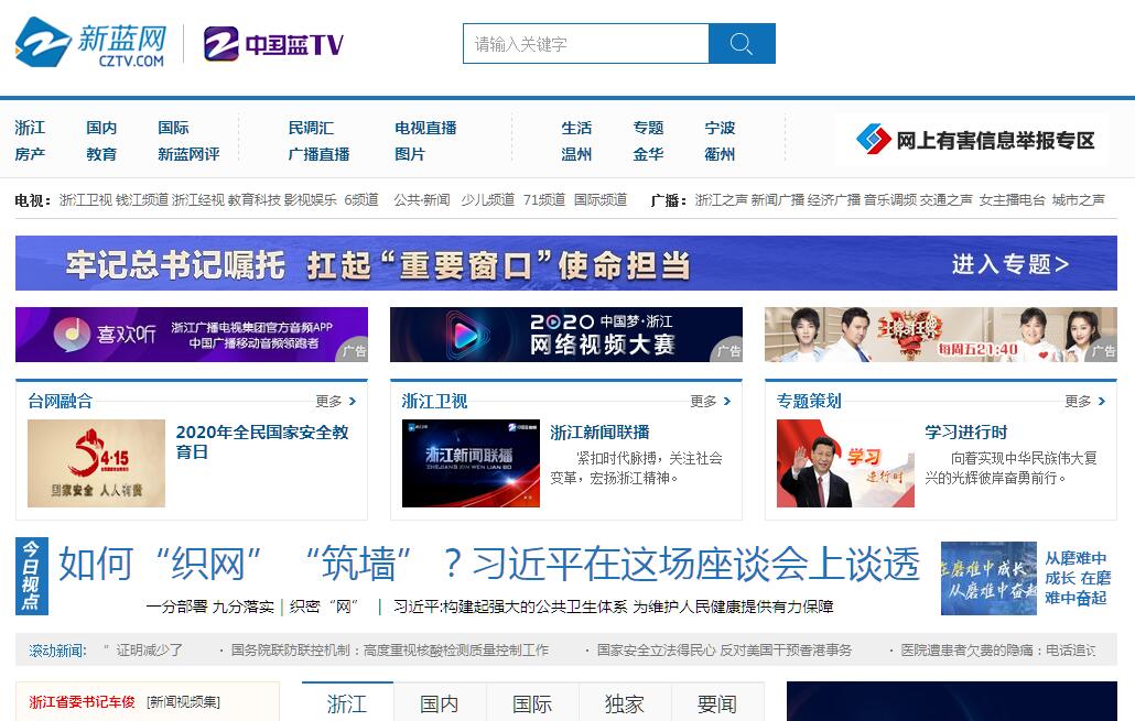 新蓝网(www.cztv.com),由浙江广播电视集团整合旗下18个广播电视频道相关资源组建而成,依托浙江广电雄厚的内容、技术、人才、影响力优势,由国务院新闻办公室授予新闻采制发布许可证,并同时拥有浙江网络广播电视台(tv.cztv.com)和浙江手机台(m.cztv.com),形成“一网两台,立体传媒”的总体传播格局。浙江网络广播电视台,是国家广电总局正式批准的全国首批省级网络广播电视台之一,是名副其实的网上主流媒体。新蓝网:强调“新闻立网,突出特色”,立足“时政、民生、娱乐”三大主题,内容涵盖全方位的节目直播、新闻资讯、影视娱乐、名播名博、深度访谈、新锐时评、大型活动,以及浙商、体育、教育、财经等众多专业特色频道,力主打造“浙江第一新闻视频门户”。连续四年被评为“浙江省创优创新网站”。浙江网络广播电视台:突出“自办直播、参与互动、个性分享”,建有门类齐全、规模较大的复合互动社区,设有娱乐、微博、论坛、名播、游戏、动漫、摄影、拍客等诸多专区,充分满足网上人群发布、表达、交流等各种多元化、个性化诉求。浙江手机台:借助“三网融合”发展之力,与浙江联通、浙江电信、浙江移动合作开办。技术兼容当下各种主流机型,内容涵盖各种直播、点播、专题,充分展示着“小视窗,大视界”的独特魅力。已在移动终端领域拥有较强的传播力和影响力。新蓝网、浙江网络广播电视台、浙江手机台,面向市场,服务民众,努力为天下网友提供互联网、通信网、电视网三网融合、无缝衔接的新媒体优质体验。