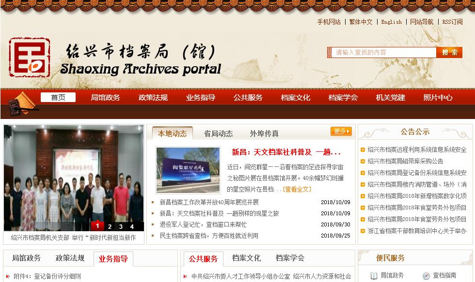 绍兴市档案馆前身是绍兴地区档案馆,成立于1979年3月,1984年11月更名为绍兴市档案馆,1986年成立绍兴市档案局,1996年7月,局馆合并,一个机构,两块牌子,为正县(处)级单位,行使行政管理和保管利用两种职能,内设办公室、监督指导(法制、行政审批)处、保管利用处、技术处、编研处、文件查阅中心和登记备份中心,现有编制26人,实有人数26人,其中领导职数4人,局(馆)人员均参照公务员管理。现市档案馆为国家一级档案馆。绍兴市国家综合档案馆新馆03年立项, 06年5月动工兴建,08年7月竣工落成。新馆占地43.5亩,总建筑面积21477平方米,总投资10562万元。其中,库房高5层,总面积5273平方米,有4个近1200平方米的超大库房和6个特色小库房构成,同时预留了等土地面积的二期库房。绍兴市档案馆新馆是绍兴历史文化名城的又一标志性建筑,具备“爱国主义教育基地、档案安全保管基地、档案利用服务中心、政府信息公开中心、电子文件管理中心”等“五位一体”的现代新型档案馆的功能。截止目前,绍兴市档案馆馆藏481个全宗,实际馆藏档案共728437卷(其中照片2125卷/67663张),11678盒/380277件(其中书画1873幅,地籍图137张,地图62张),光盘8357张,磁带72盒,像带207盒,唱片36张,资料21495册(含家谱397册),实物1189件。