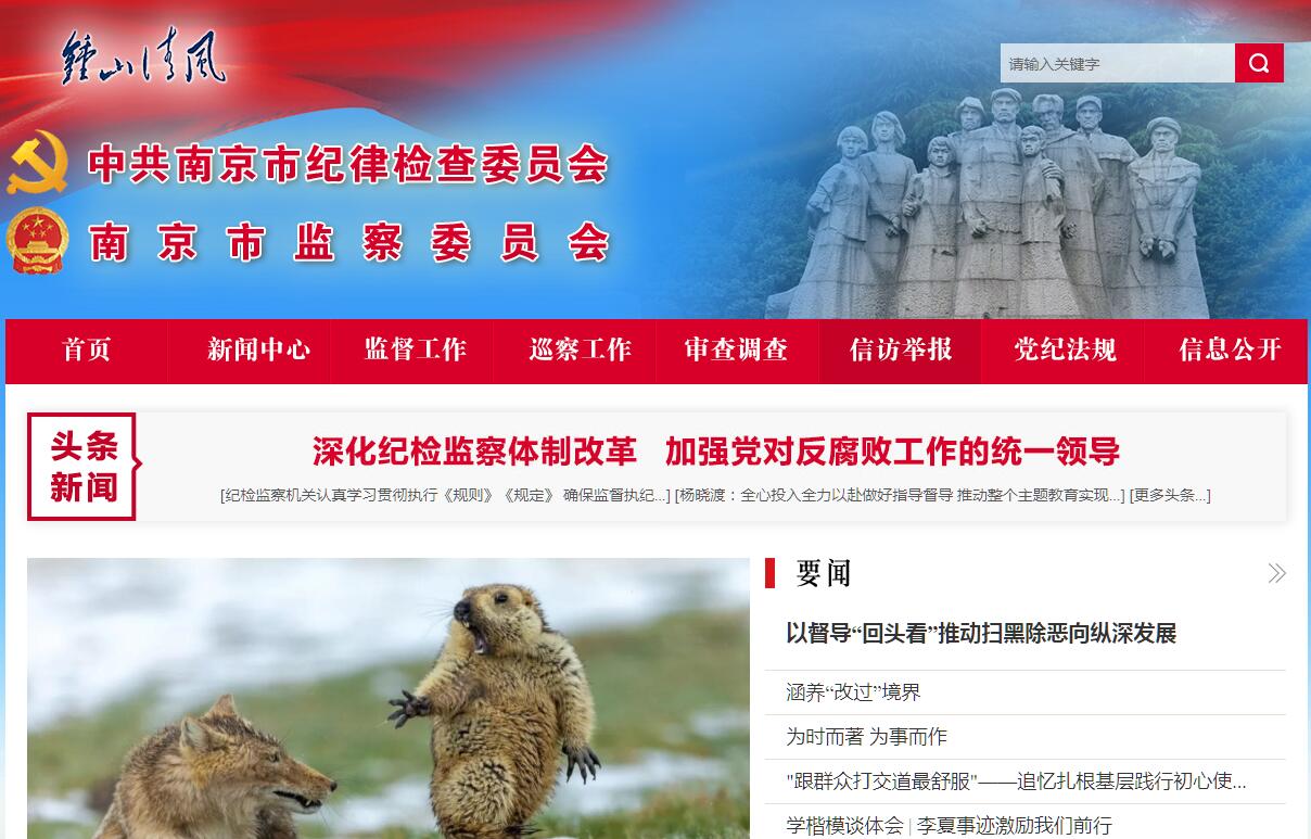 | 网站简介: 欢迎您访问南京市纪检监察网站!南京市纪检监察网站是由中共南京市纪律检查委员会、南京市监察委员会主办的综合性政务门户网站。网站作为中共南京市纪律检查委员会、南京市监察委员会信息公开、新闻宣传、举报监督、互动交流的主渠道、主阵地,紧紧围绕党风廉政建设和反腐败工作中心任务,以中共南京市纪律检查委员会、南京市监察委员会和全市各级纪检监察机关为支撑,倾力打造权威发布平台、工作展示平台、宣传教育平台、与民互动平台、网络举报平台,为党风廉政建设和反腐败工作提供舆论支持和宣传服务。欢迎大家对南京市纪检监察网站提出意见和建议。 |