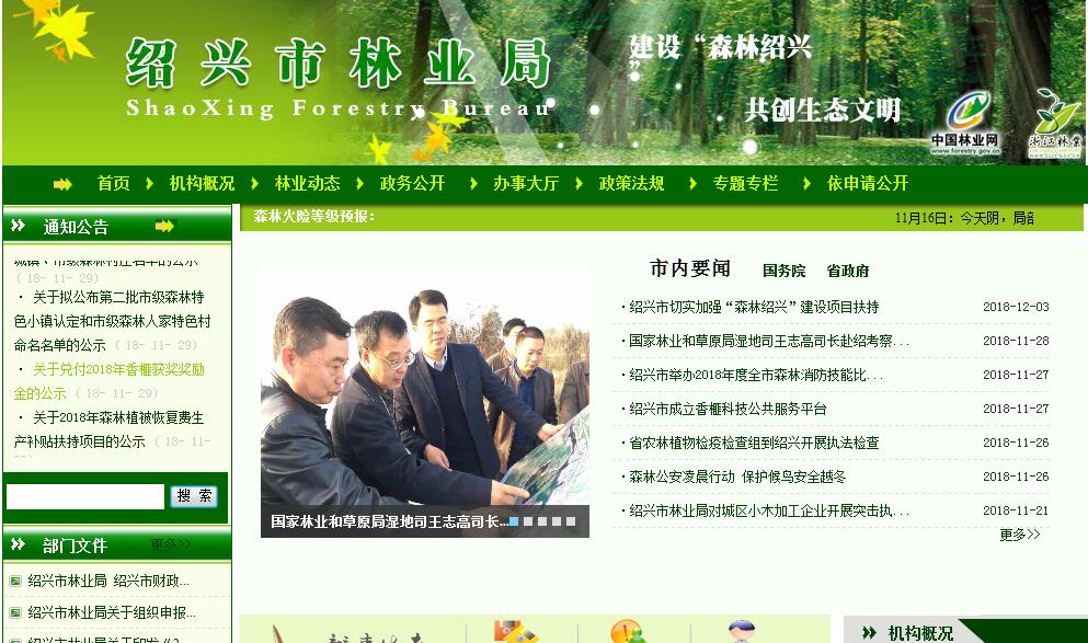 绍兴市林业局主要职责:(一)负责全市林业及其生态建设的监督管理。拟订林业及其生态建设的政策、发展战略、中长期规划和起草相关规范性文件并监督实施。(二)组织、协调、指导和监督全市造林绿化工作。制定全市造林绿化的指导性计划,组织拟订相关市级技术标准和规程并监督执行。指导森林经营和各类公益林及商品林的培育、管理工作,指导植树造林、封山育林和以植树造林、封山育林等生物措施防治水土流失和及防沙治沙工作,指导和监督营林生产安全管理工作;指导国有林场(国有苗圃)、森林公园及林业工作站、集体林场的建设和管理;组织指导林木种子种苗的管理工作。承担林业应对气候变化的相关工作。(三)负责森林资源保护发展监督管理。组织、指导全市森林资源管理,组织编制全市森林采伐限额方案,经市政府报省政府批准后监督执行;监督检查林木(毛竹)凭证采伐、运输;组织、指导林地、林权管理,组织实施林权登记、发证工作;拟订林地保护利用规划并指导实施,依法对林地征用、占用进行审批或审核报批。按规定权限承担国有森林资源产权变动的核准或审批报批工作。(四)依法组织、指导陆生野生动物资源和林区内野生植物、林区外珍贵野生树木资源的保护、合理开发利用、救护繁育、栖息地恢复发展和疫源疫病监测,监督管理陆生野生动物和林区内野生植物、林区外珍贵野生树木猎捕或采集、驯养繁殖或培植、经营利用,负责濒危物种进出口和国家保护的野生动物、珍稀树种、珍稀野生植物及其产品出口审核报批的有关工作。组织、协调、指导和监督全市湿地保护工作。拟订全市湿地保护规划和湿地保护的有关规定,组织开展湿地保护区、保护小区、湿地公园等保护管理工作,指导、监督湿地的合理利用。依法指导森林、湿地和陆生野生动物类型自然保护区的建设、管理和合理利用工作。监督管理林业生物种质资源、植物新品种保护,按分工负责生物多样性保护及其有关国际公约的履约有关工作。(五)指导全市森林公安工作,监督和管理森林公安队伍;在市公安局的组织、指导下,协助开展狩猎组织和狩猎枪支及其弹药的管理工作;指导、协调、监督全市森林病虫害防治、森林植物检疫、外来林业有害生物入侵的防范工作;指导和监督森林防火和火灾扑救等安全管理工作;组织指导全市林业标准化、林业技术监督、林产品质量监督的有关工作。(六)参与拟订林业及其生态建设的财政、金融、价格、贸易等经济调节政策,参与组织、指导林业及其生态建设的生态补偿制度的建立和实施。提出市级财政林业专项转移支付资金的预算建议,参与监督管理市级林业资金;监管国有林业资产;编制林业及其生态建设的年度生产计划。(七)负责推进林业改革,维护农民经营林业合法权益。拟订集体林权制度、国有林场等重大林业改革意见并指导监督实施。拟订农村林业发展、维护农民经营林业合法权益的政策措施,指导、监督农村林地承包经营和林权流转,承担和指导林权纠纷调处和林地承包合同纠纷仲裁。(八)组织、指导全市林业产业发展工作。制定全市林业产业中长期发展规划,指导林业特色基地、龙头企业和森林旅游的发展,做好休闲观光林业的安全管理工作,组织、指导林业行业协会建设,做好林业专业合作经济组织的扶持服务工作。(九)组织、指导林业及其生态建设的科技、教育、宣传工作;协调林业系统对外交流和合作。(十)承办市政府交办的其他事项。