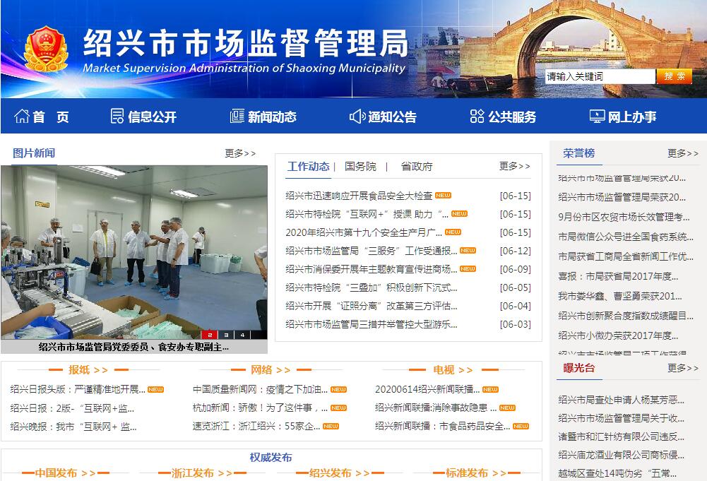 绍兴市市场监督管理局主要职责:一、负责市场综合监督管理。组织实施国家、省有关市场监督管理法律、法规和规章,拟订并组织实施有关市场监督管理的规范性文件。组织实施质量强市战略、食品安全战略、标准化战略和知识产权战略,拟订并组织实施有关规划,规范和维护市场秩序,营造诚实守信、公平竞争的市场环境。二、负责市场主体统一登记注册。指导各类企业、农民专业合作社和从事经营活动的单位、个体工商户以及外国(地区)企业常驻代表机构等市场主体的登记注册工作,扶持个体、民营经济发展。三、负责市场主体信息公示和共享机制建设。依法公示和共享有关信息,加强信用监管,推动市场主体信用体系建设。四、负责监督管理市场秩序。依法监督管理市场交易、网络商品交易及有关服务行为。组织查处价格收费违法违规、不正当竞争、违法直销、传销、侵犯商标专利知识产权和制售假冒伪劣行为。参与制定商品交易市场发展规划并与相关部门建立沟通协作机制,规范商品交易市场、农贸市场秩序,指导商品交易市场提升发展和农贸市场改造提升工作。指导广告业发展,监督管理广告活动。指导查处无照生产经营和相关无证生产经营行为。指导消费维权工作和消费环境建设。五、负责反垄断相关工作。统筹推进竞争政策实施,指导实施公平竞争审查制度。根据省市场监督管理局委托,开展相关反垄断调查工作。指导绍兴企业在国外的反垄断应诉工作。六、负责组织和指导市场监管综合行政执法工作。贯彻落实中央、省和市关于市场监管综合行政执法改革相关文件精神,指导推进全市市场监管综合行政执法改革工作。组织、指导市县市场监管综合行政执法队伍整合和建设,落实将商务执法、盐业执法整合纳入市场监管执法相关工作。规范市场监管行政执法行为。组织查处重大违法案件。七、负责知识产权监督管理。拟订并组织实施知识产权创造、保护和运用的政策、规划,建设完善知识产权保护体系、公共服务体系,指导商标专利执法,保护知识产权,促进知识产权创造和运用。八、负责宏观质量管理。拟订并实施质量发展的制度措施。协调推进区域品牌建设,统筹质量基础设施建设与应用,会同有关部门组织实施重大工程设备质量监理制度,组织重大质量事故调查,落实缺陷产品召回相关工作,监督管理产品防伪工作。九、负责产品质量安全监督管理。管理产品质量安全风险监控、监督抽查工作。组织实施质量分级制度、质量安全追溯制度。组织实施工业产品生产许可管理。负责纤维制品质量监督工作。十、负责食品安全监督管理综合协调。组织制定食品安全重大政策并组织实施。负责食品安全应急体系建设,组织指导重大食品安全事件应急处置和调查处理工作。落实食品安全重要信息直报制度。承担市食品安全委员会的日常工作。十一、负责食品安全监督管理。建立实施覆盖食品生产、流通、消费全过程的监督检查制度和隐患排查治理机制,防范区域性、系统性食品安全风险。推行食品生产经营者落实主体责任机制,健全食品安全追溯体系。组织开展食品安全监督抽检、风险监测、核查处置和风险预警、风险交流工作。组织实施特殊食品监督管理。十二、负责药品安全监督管理。监督实施药品标准及分类管理制度,监督实施质量管理规范。组织开展药品不良反应监测、评价和处置工作。依权限或根据省药品监督管理局委托,组织、指导药品生产、经营环节的许可、备案、检查以及药品生产、经营、使用环节违法行为的查处。组织实施执业药师资格准入制度及执业药师注册工作。负责现代医药产业人才队伍建设。配合有关部门指导药品行业生产经营企业做好生态环境保护和污染防治工作。十三、负责医疗器械安全监督管理。监督实施医疗器械标准及分类管理制度,监督实施医疗器械经营质量管理规范。组织开展医疗器械不良事件监测、评价和处置工作。依权限或根据省药品监督管理局委托,组织、指导医疗器械生产、经营环节的许可、备案、检查以及医疗器械生产、经营、使用环节违法行为的查处。配合有关部门指导医疗器械行业生产经营企业做好生态环境保护和污染防治工作。十四、负责化妆品安全监督管理。组织监督实施化妆品标准及分类管理制度,监督实施化妆品质量管理规范。组织开展化妆品不良反应监测、评价和处置工作。依权限或根据省药品监督管理局委托,组织、指导化妆品生产环节的许可、备案、检查以及化妆品生产、经营环节违法行为的查处。十五、负责特种设备安全监督管理。综合管理特种设备安全监察、监督工作,监督检查高耗能特种设备节能标准和锅炉环境保护标准的执行情况。十六、负责统一管理计量工作。推行法定计量单位和国家计量制度,管理计量器具及量值传递和比对工作。规范、监督商品量和市场计量行为。十七、负责统一管理标准化工作。组织协调并指导推动各部门、各行业的标准化工作。依法组织制定地方标准。依法对标准的实施进行监督。十八、负责统一管理检验检测工作。推进检验检测机构改革,规范检验检测市场,完善检验检测体系,指导协调检验检测行业发展。十九、负责统一管理、监督和综合协调认证认可工作。组织实施统一的认