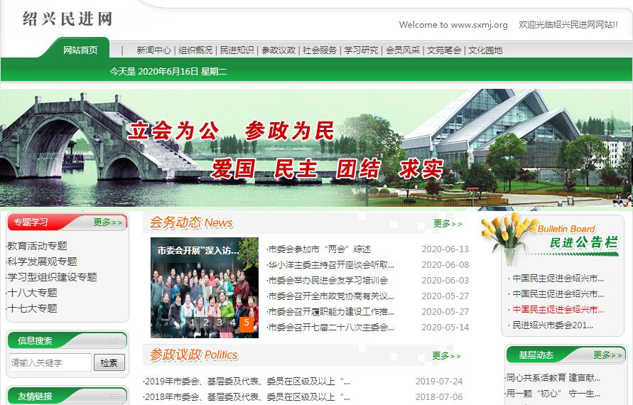 民进绍兴市委会成立于1985年12月。陶永铭任民进绍兴市第一届委员会主任委员。杨明志任第二、三届委员会主任委员。陈伯怀任第四、五、六届委员会主任委员。2015年1月8日,召开民进六届第十一次全会,同意陈伯怀因年龄原因辞去六届委员会主委职务,选举华小洋为六届委员会主委。华小洋现任第七届委员会主任委员。市委会委员有17人。截至2016年12月底,我会有在册会员545名,分布在全市教育、文化、医卫、社科、经贸、政法、政府机关、人民团体等各界。会员中具有大专以上文化程度的513人,占会员总数的94.1%,具有中高级职称的462人(其中高级227人),占会员总数的84.8%(其中高级占41.7%)。会员平均年龄51.7岁,其中退休人员148人,占会员总数的27.2%。现有基层组织36个, 其中有基层委员会4个,支部32个。截至2016年12月底,会员中有省人大代表1名,省政协委员2名,市人大代表6名,市政协委员30名,县(市、区)人大代表6名,政协委员32名。至今,担任各级人大代表、政协委员人数已达77名,占会员总数的14.1%。会员中有14人先后受聘担任市、县两级教育、审计、司法、监察、质监、药监、环保等部门特约人员,履行民主监督职能。近5年来,市委会先后被民进中央授予民进全国宣传思想工作先进集体、民进全国社会服务工作先进集体、民进全国参政议政工作先进集团、民进参与毕节试验区建设“同心•彩虹行动”先进集体等荣誉称号。6次获省委会各类单项先进。有4个支部被民进中央授予民进全国先进集体,有10个支部被民进省委会授予优秀基层组织荣誉称号。有5名会员被民进中央授予全国先进个人。市委会机关3次获得年度市级机关(部门)工作目标责任制考评一等奖部门。市委会办有绍兴民进网站和《绍兴民进》会刊,开通了微信公众号。