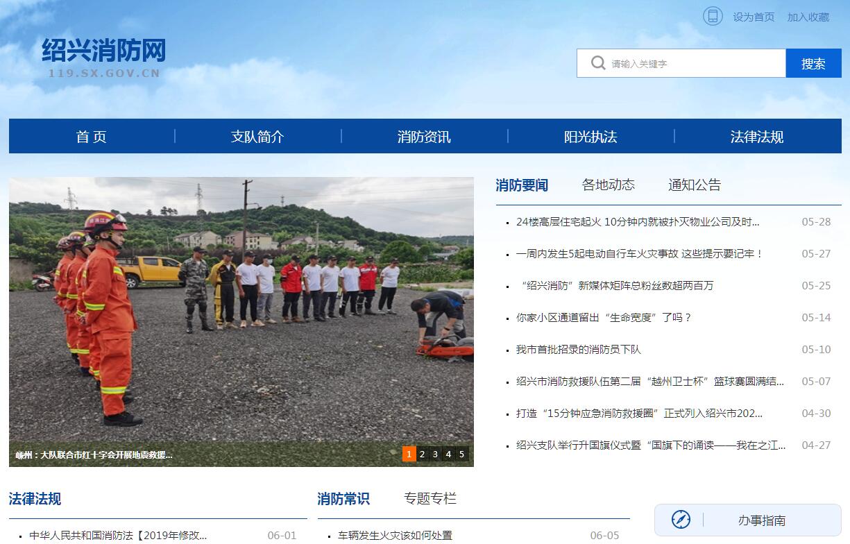 绍兴消防网由绍兴市消防救援支队主办。绍兴市消防救援支队下辖越城、柯桥、诸暨、上虞、嵊州、新昌、滨海新城7个大队和支队直属的战勤保障大队,现有21个执勤中队,配有各类执勤消防车140辆(举高类24辆、灭火类74辆、专勤车27辆、战保车15辆),进口车92辆,占总数的70.2%,各类器材装备4.2万余件(套),泡沫储量160余吨。近年来,绍兴市消防救援支队围绕服务经济社会发展大局,紧盯防火、灭火两大中心任务,坚持问题导向,强化创新发展,消防工作和队伍建设取得了显著成效。支队党委连续三年(2014年至2016年)被总队党委评为“好班子”,支队两次(2014年、2016年)被总队评为先进支队,两次(2013年、2015年)被市政府荣记集体二等功,2016年被市委市政府评为“最美绍兴人”称号,2017年被市政府授予“人民满意消防卫士”称号、先进劳动模范集体。2019年荣膺首届“绍兴青年五四奖章集体”。近年来,先后有1个单位荣立集体一等功,4个单位荣立集体二等功,21个单位荣立集体三等功,7人次荣立个人一等功,18人次荣立个人二等功,8名个人分别被评为全国优秀人民警察、浙江杰出青年、全省模范人民警察等称号。近年来,在全市实施“百千万”消防队伍建设工程,按照“有组织领导、有合格队员、有标准装备、有经费保障、有完善制度”的“五有”标准建设标准化专职、志愿消防队伍。目前,全市共有专职消防队82支、志愿消防队1368支、志愿消防队员8000余人。同时,262个社区和1402家消防安全重点单位建立微型消防站,117个乡镇(街道)落实消防安全网格规范化管理。