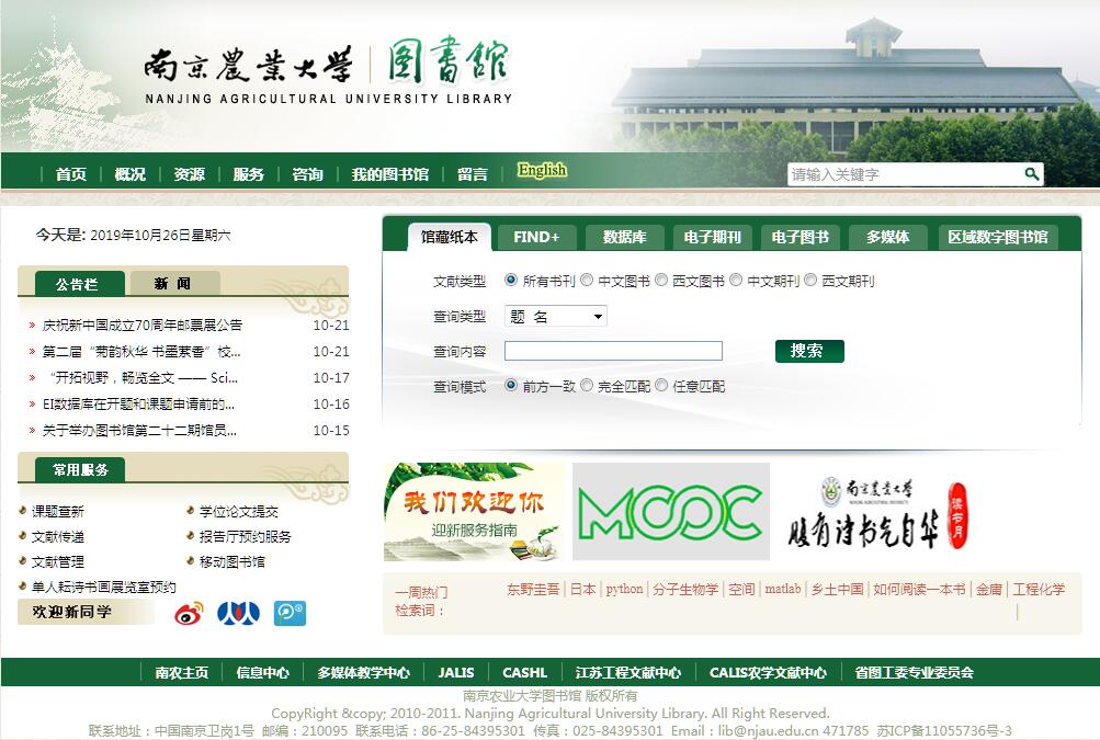 南京农业大学图书馆是由原金陵大学图书馆、中央大学图书馆的部份人员和书刊合并建设而成。图书馆实行总馆分馆制,总馆(卫岗校区图书馆)下设浦口分馆(浦口区点将台路40号)、社科分馆(逸夫楼5079、6003室)、畜牧兽医分馆(逸夫楼2032~2034室)、农业遗产分馆(逸夫楼6011室)。总建筑面积3.24万平方米。设有阅览座位4470席,实际在用有线网络信息点1020个,无线网络全覆盖。现有馆藏纸质书刊235.4万册,电子图书1500余万册,电子西文期刊13800种,电子中文期刊15200种,国内外数据库120种,自建特色数据库6个。图书馆建有1902信息共享空间、单人耘诗书画展览室、多媒体学习室等服务设施,每周开放101小时,年接待读者近220万人次,年纸本流通总量约50万册。图书流通采用汇文文献信息服务系统,并与校园一卡通系统接轨,读者可使用校园卡在馆内通过门禁、接受服务、自助缴费、自助充值等。图书馆、图书与信息中心合署办公,不仅是学校的文献资源中心,同时还是校园信息化中心、现代教育技术中心,负责全校校园信息化的规划、建设、管理与服务工作;是中国高等教育学会教育信息化分会理事单位,中国教育技术协会高等农业院校分会理事长、秘书长单位,中国农学会农业图书馆分会、科技情报分会常务理事单位,江苏省图书馆学会常务理事单位,江苏省高等院校教育技术研究会常务理事单位;是教育部查新检索单位,江苏省高校农学文献中心,江苏省高校教育技术培训基地,江苏省党员干部远程教育教学资源建设基地。学校中心馆设有办公室、读者服务部、特藏部、文献资源建设部、研究支持部、策划推广部、教育技术部、网络运营部、用户服务部、信息应用部、信息化管理办公室,常年开展书刊借阅、电子阅览、电子书刊借阅、自助打印复印、书目信息查询、读者信息查询、读者培训、参考咨询、科技查新、文献传递、重点学科导航、校园网接入与管理、校园网和图书馆网站建设、教学视频资源库建设与管理、电视教学片摄制、多媒体课件制作等服务工作。图书馆与南京航空航天大学图书馆、南京理工大学图书馆、南京林业大学图书馆、南京体育学院图书馆共同建设成立了南京城东高校图书馆联合体,通过统一的图书资源检索平台,实现了纸本图书通借通还,电子图书共知共享。