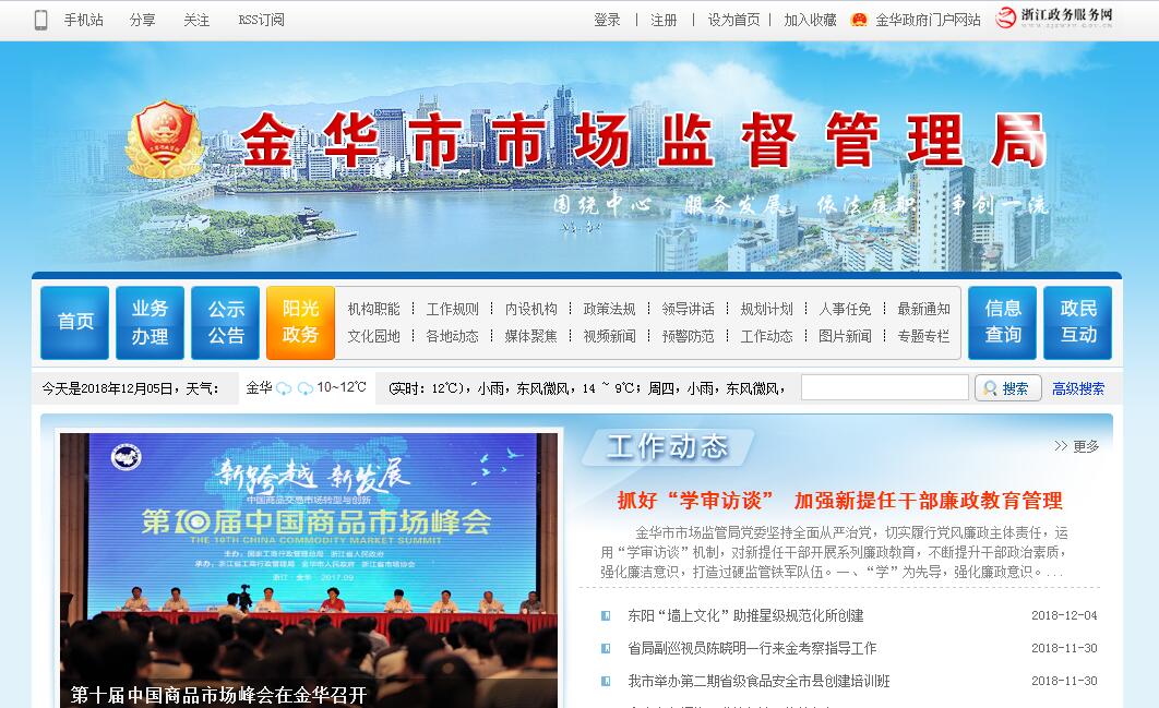 金华市市场监督管理局主要职责:(一)贯彻执行工商行政管理、食品药品(含食品添加剂、保健食品、化妆品、中药、民族药、医疗器械,下同)监督管理方面的法律、法规、规章和政策,查处违反工商行政管理和食品药品监督管理法律法规的行为;拟订并组织实施相关规范性文件和市场监督管理事业发展规划。(二)负责市场监管应急体系建设,监督实施食品药品重大信息直报制度,依法统一发布重大食品安全信息;着力防范区域性、系统性食品药品安全风险;组织和指导食品药品安全事故应急处置和调查处理工作,督促检查事故查处落实情况;组织协调食品药品安全宣传、教育培训工作。(三)承担市食品安全委员会办公室日常工作。负责食品安全综合协调,推动健全协调联动机制;组织拟订食品安全规划,并协调推进实施;建立食品安全隐患排查治理机制,制定年度检查计划、重大整顿治理方案并组织实施;督促检查各县(市、区)政府和市政府有关部门履行食品安全监督管理职责情况,并负责考核评价。(四)负责涉及工商行政管理、食品药品监督管理的行政审批工作,包括各类企业、合作社和从事经营活动的单位、个人以及外国(地区)企业常驻代表机构等市场主体的登记注册和食品、药品、保健食品、化妆品、医疗器械等行政许可,并依法进行监督管理。(五)拟订制定商品交易市场发展规划,依法规范和维护各类市场经营秩序,监督管理市场交易行为和网络商品交易及有关服务行为,负责监督管理流通领域商品质量。(六)开展消费维权工作,承担消费者权益保护职责,建立消费者权益保护体系;负责涉及市场监督管理相关举报投诉的受理、处理和网络体系建设等工作。(七)负责经纪机构、经纪人和经纪活动以及直销企业、直销员和直销行为的监督管理;开展反垄断执法监管工作;实施合同行政监督管理,组织实施消费类格式合同条款备案;管理动产抵押物登记;监督管理拍卖行为。(八)组织实施商标战略,负责商标监督管理工作,依法保护商标专用权和查处商标侵权行为;指导培育驰名商标,审核推荐省著名商标,组织认定市著名商标;依法保护特殊标志、官方标志;指导广告业发展,依法负责广告活动的监督管理工作。(九)负责企业信用体系建设;组织指导企业、个体工商户、商品交易市场信用分类管理,研究分析并依法发布市场主体登记注册基础信息,为政府决策和社会公众提供信息服务。(十)负责个体工商户、私营企业经营行为的服务和监督管理。(十一)监督管理生产加工、流通和餐饮环节的食品安全;对生产加工、流通和餐饮环节的食品质量进行监测;监督实施餐饮食品安全标准和管理规范;指导协调重大活动餐饮食品安全。(十二)负责保健食品、化妆品生产经营的监督管理,监督实施保健食品、化妆品标准和技术规范;组织实施保健食品和化妆品安全性检测和评价、不良反应监测。(十三)负责药品和医疗器械生产、经营、使用环节的监督管理;建立药品不良反应、医疗器械不良事件监测体系,并开展监测工作。(十四)指导全市食品药品检验检测机构业务工作;监督实施国家药品、药用辅料、直接接触药品的包装材料和容器标准。(十五)配合市政府有关部门实施国家食品医药产业政策和国家基本药物制度;贯彻实施执业药师资格认定制度,配合实施医药从业人员职业资格准入制度。(十六)负责对所辖县(市、区)市场监督管理局的业务指导、监督检查和工作考核;按照领导干部实行双重管理的要求,协助管理县(市、区)市场监督管理局领导班子。(十七)指导与工商行政管理、食品药品监督管理业务有关的社会团体的工作。(十八)承办市政府及上级部门交办的其他事项。