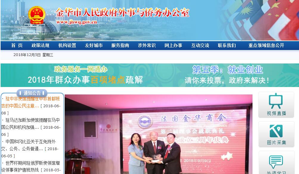 金华市人民政府外事与侨务办公室主要职责:(一)外事。1、贯彻执行国家的对外方针政策、涉外法规以及市委、市政府关于外事工作的指示和决定。2、当好市委、市政府外事工作的助手和参谋。提出制订本地区外事工作的规章制度和工作规划的建议;检查本地区有关部门和单位贯彻执行对外方针、政策和涉外法规的情况;协调本地区的重大外事工作和涉外活动;负责处理或协助处理本地区重大的涉外事务。3、围绕本地区经济建设和对外开放进行外事调查研究,为市委、市政府的对外工作决策提供意见和建议;利用对外交往渠道,为本地区的经济建设和社会发展服务。4、审核本地区各部门、各单位报请省委或省政府审批的外事文件;承办市委、市人大、市政府和市政协领导人出访和邀请外国重要团组和政府领导来访的具体报批事宜;在授权范围内,审批(核)本地区团组、人员临时因公出国(境)和邀请外国相应人员来访的有关事宜;审批(核)和代办本地区因公出国人员的护照、签证和应邀来访我国人士的签证通知函电以及其他领事业务;对违反政策规定的事件进行查处或配合有关部门查处。5、负责组织接待来本地区访问的国宾、党宾和其他重要外宾;接待来本地区进行公务活动的外国驻华外交人员;统筹安排市委、市人大、市政府和市政协领导的外事活动。6、了解和检查本地区所属因公出国(境)团组和人员在国外活动情况。定期综合本地区因公出国(境)和邀请外国人来访的情况,每半年向市委、市政府和省外事办公室提出书面报告。7、负责外国驻华使(领)馆机构的交涉事宜;统筹安排和管理本地区各部门、各单位与外国领事机构的交往活动。8、管理本地区与外国友好城市和其他结好单位的交往活动,办理对外结好的报批手续。指导本地区民间对外交往工作。9、管理来本地区采访的外国记者;指导本地区有关部门和单位做好外国记者采访活动的安排。10、管理或指导有关部门管理外国专家及出国培训工作;处理或协助有关单位处理涉及外国人管理工作的重要事项。11、负责对本地区外事干部和涉外人员进行对外政策和外事纪律的教育;组织外事干部的对外政策业务培训;总结交流本地区外事工作经验。12、配合和协助党委宣传部门做好对外宣传和群众性外事教育工作;根据党中央和国务院及主管部门的文件和材料,向本地区各部门提供国际形势、对外政策和重大国际问题的宣传材料和对外表态口径;协同审核本地区重要涉外报道稿和有关其他文稿。13、认真贯彻执行《涉外人员守则》;配合纪检、监察和保密部门检查外事纪律及保密制度的执行情况;及时向有关部门提出违反外事纪律问题的处理意见和建议。(二)侨务。1、贯彻执行党和国家有关侨务工作的方针、政策、法规,并负责监督检查贯彻执行情况。调查研究国内外侨情和侨务工作情况,向市委、市政府提供侨务信息;受委托研究起草有关侨务行政管理的地方性规章和政策草案,经审议通过后组织实施;制订本市侨务工作的发展规划。2、对有关部门和社会团体开展的华侨、华人工作进行必要的统筹、协调。指导县(市、区)侨务工作。3、调查研究引进华侨华人、香港和澳门特别行政区同胞资金、技术、人才工作的情况并提出政策建议;协助有关部门通过侨务渠道开拓国际市场。4、贯彻执行《中华人民共和国归侨、侨眷保护法》,依法保护归侨、侨眷和香港、澳门特别行政区同胞在内地的合法权益,开展归侨、侨眷工作;协助有关部门做好归侨、侨眷代表人士的人事安排工作。5、开展华侨华人、香港和澳门特别行政区同胞及其社团的团结友好工作。配合有关部门做好华侨和香港、澳门特别行政区同胞代表人物的人事安排工作。6、负责华侨回国安置工作,负责香港、澳门特别行政区同胞回内地定居及其在内地眷属工作;经授权,负责处理本市与香港、澳门民间交往事务;确认华侨、归侨、侨眷的身份。7、在中央对台工作方针的指导下,通过侨务渠道开展对台工作。8、开展对华侨华人、香港和澳门特别行政区同胞的宣传、文化交流和华文教育工作,联系华侨华人、香港和澳门特别行政区同胞传播媒体、文化社团及华人学校。9、负责华侨华人、香港和澳门特别行政区同胞捐赠工作。10、办理市委、市政府和上级交办的事项。(三)港澳(筹)。1、研究港澳社会各方面情况;2、统筹协调各部门、各地区与香港、澳门特别行政区的官方联系;3、负责接待港澳官方代表团的来访;联系我市领导赴港澳访问;4、促进、协调我市与香港、澳门在经济、科教、文化等领域的合作与交流;5、负责我市因公赴港澳人员的审批、办证等事项;6、参与对我市在港澳中资机构和劳务输出的管理;7、宣传香港基本法及中央政府对港澳的方针政策。