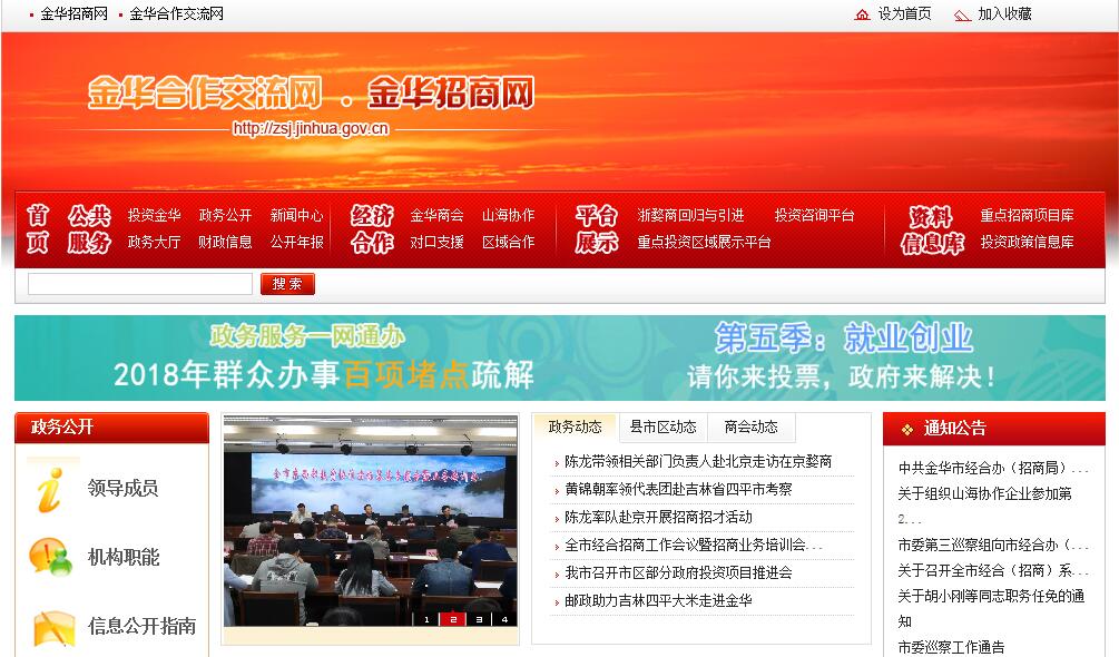 金华市人民政府经济合作交流办公室(金华市招商局) 主要职责:(一)负责全市招商引资的综合协调。制订招商引资发展规划、发展战略、政策措施、目标任务和考核办法。(二)负责招商引资目标责任的考核督查,指导服务各县(市、区)、开发区、有关部门(单位)开展招商引资工作。(三)牵头收集、筛选、整理、汇总全市招商合作项目,发布招商信息,开展投资环境、投资政策、重点招商项目的宣传推介工作。(四)配合市有关部门对重点区块的统筹招商,参与重大招商引资活动,参与重大招商项目的考察、论证、洽谈和签约工作。对招商项目开展跟踪、联系、督查、落实。(五)负责组织、协调、指导、实施全市浙(婺)商回归创业工作。(六)负责开展国内经济合作交流情况的调查研究和信息收集;研究制定我市与外地市开展经济合作交流的有关政策,并组织实施。(七)负责外地市经济合作代表团组的来访接待和市领导赴外地市有关经济合作交流出访工作的组织、协调与服务工作。(八)负责指导外地驻金商会、异地金华商会的建设以及日常联络、指导和服务工作;协调和处理我市企业向外拓展过程中出现的问题以及为外地企事业单位到金华投资兴业提供必要的联络与服务。(九)负责组织、指导、协调实施全市“山海协作工程”、对口帮扶四川贫困地区和对口支援重庆三峡库区移民工作。(十)负责组织参与全省性的西部开发、东北振兴、中部崛起和国内重大经贸合作洽谈、重大展会洽谈等国内区域合作交流活动。(十一)负责闽浙赣皖九方经济区、长三角经济协调会等区域合作组织和缔结国内友好城市的联络、合作、协调和服务工作。(十二)承办市委、市政府交办的其他工作。
