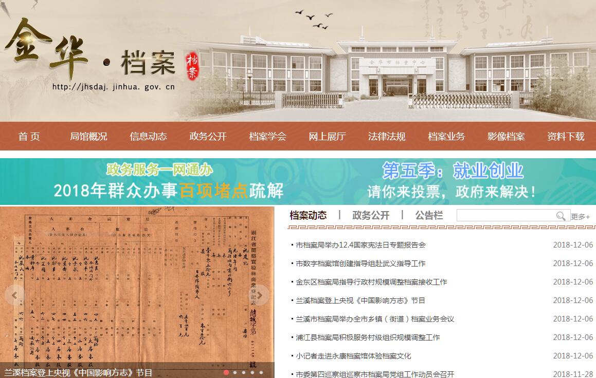 金华档案网由金华市档案局主办。金华市档案馆始建于1982年6月。2001年2月因撤县设区、行政区划调整,原金华县档案馆与市档案馆合并。两馆合一后,现有馆藏405个全宗,20余万卷档案资料,主要为建国后市、县党政机关、有关企事业单位档案(其中革命历史档案、民国档案8000余卷)。市档案馆依法接收,保管市、区两级党政机关及有关单位档案,并致力于面向社会收集、征集档案资料。现收集有严济慈、邵飘萍、施光南、陈双田等名人档案资料;党和国家领导人来金视察的照片;党和国家领导人的签名题字手迹等。馆藏资料较为珍贵的有:1921年-1949年《中共中央文件选集》、民国《临时政府公报》、《中国国民党历次代表大会及中央全会公报》、《两朝御批历代通鉴辑览》、《康熙朝汉文硃批奏摺汇编》、《大清一统志》、《大清新刑律》、《刑事诉讼律》、《民事诉讼律》、康熙《金华府志》、道光、光绪、民国《金华县志》、明版、光绪《汤溪县志》、《金华丛书》、《金华图书概览》。 由各地出版的“写金华”、“金华人写”的各类图书1500多种。由金华市档案馆编撰的编研资料有:《古婺新旅》、《金华地区行政区划文件汇编》、《婺州风云录》、《金华市灾情录》、《金华市全市综合档案馆简介》、《金华地委组织和机构沿革简介》、《金华市档案利用典型事例选编》等,详见《金华市档案馆编研成果一览表》。