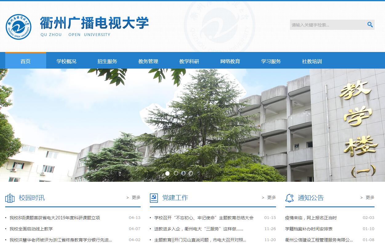 衢州广播电视大学隶属于衢州市人民政府,教学业务接受浙江广播电视大学指导和管理,是一所运用计算机多媒体网络等现代化教学手段进行远程教育的新型开放大学。学校下辖江山、常山、开化、龙游、柯城5个县(市、区)电大分校(学院)。学校的前身为浙江广播电视大学衢县工作站,创办于1979年7月。1985年8月,在原工作站基础上建立浙江广播电视大学衢州分校。1995年12月,更名为衢州广播电视大学。2003年12月,成立衢州社区大学。2016年11月,成立衢州老年开放大学,与衢州广播电视大学、衢州社区大学、衢州广播电视中等专业学校实行四块牌子一套班子的运行体制。学校占地面积40亩,建筑面积1.3万平方米,内设机构有一室六处即办公室、教学与科研处、教务处、学生处、社区教育培训处、网络教育处和后勤技术处。学校编制数45名,现有在编教职工45人,合同制人员8人。其中具有高级职称5人,中级职称31人。另外学校配备了相对稳定的外聘教师89人,客座(兼职)教授30名。学校现有学历教育在校生4500余名。截止目前,开放教育已累计开设经济学、法学、文学、教育学、理学、工学、农学、管理学等8大学科门类,本专科专业50多个,毕业生6.5万名。培养了大批“留得住、用得上、干得好”的实用型人才,为提高衢州高等教育大众化程度和各行业人员素质,为衢州市的经济社会发展做出了贡献。学校已经发展为衢州市现代远程教育中心,成为衢州创建学习型社会、构筑终身教育体系的一支生力军。学校两次被中央电大授予全国广播电视大学开放教育招生工作优秀集体荣誉称号,综合考评一直名列全省电大前茅,连续被省电大授予先进办学单位、思想政治教育工作先进单位等荣誉称号。衢州广播电视大学部门职能:(一)贯彻执行党和国家的教育方针、政策和有关教育的法律法规,研究全市电大教育改革与发展的重大问题。指导、协调各县(市、区)电大分校工作。制定电大发展规划、专业设置和有关管理规章制度。创建平安校园。(二)负责本校党的思想建设、领导班子建设和师生思想政治工作;指导、组织党群工作和社团工作;开展远程教育研究。(三)管理全市电大系统的学历及非学历教育招生、教学、考试、毕(结)业办证等工作。制定电大系统学历及非学历教育的招生计划并组织实施,负责学历教育的学籍管理和毕业办证工作,颁发自办非学历教育证书;按照中央和省级电大的教学计划和教务管理等规章制度组织实施学历教育的教学、辅导、答疑、批改作业、听课、考试、考核、实验、实习、毕业论文等教学教务管理工作。(四)负责电大全日制脱产班和业余班学生管理工作。负责聘请专、兼职教师和班主任(辅导员),做好学生日常管理工作。(五)指导管理全市电大系统教师的继续教育工作。拟定教师管理的有关政策、规章制度,统筹规划并指导学校教师和管理人员的队伍建设工作,管理和指导分校校长、在职教师和教育行政干部的学习、培训工作;组织实施教师资格制度;负责和管理教职工的岗位考核和任期考核工作;组织、指导电大系统教师的专业技术职务的推荐评审和聘任工作。(六)统筹管理本系统的教育经费;按照规定制定本系统收费标准;负责本单位的基建、财务、固定资产、经济审计等工作。(七)完成市委、市政府交办的其他事项。
